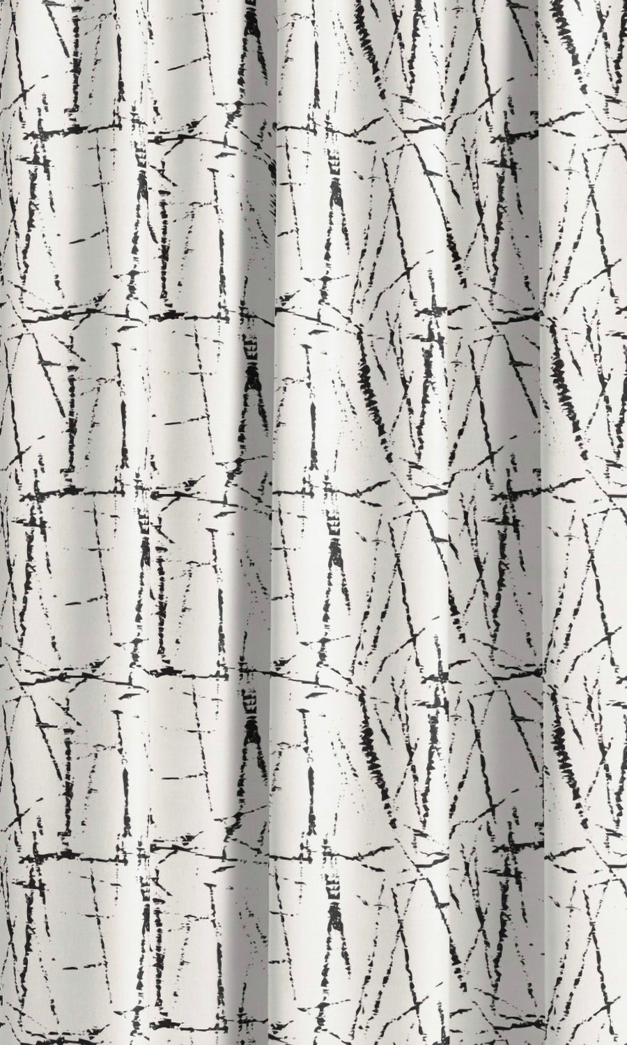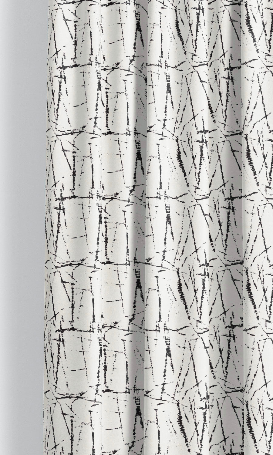- Balance a vibrant room: Harness the neutrality of Pearlesque black and white abstract print curtains to counterbalance the visual energy of bold colors and intricate patterns. Their black and white palette allows vivid tones to take center stage, while their striking contrast and abstract pattern add drama to the room without overpowering the scene.
