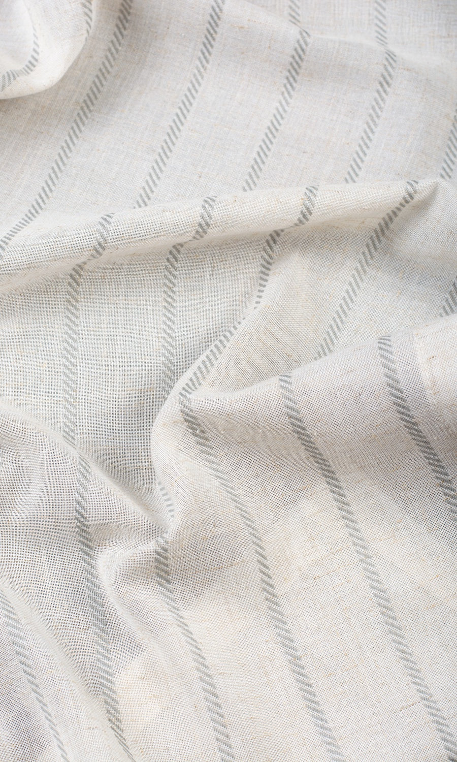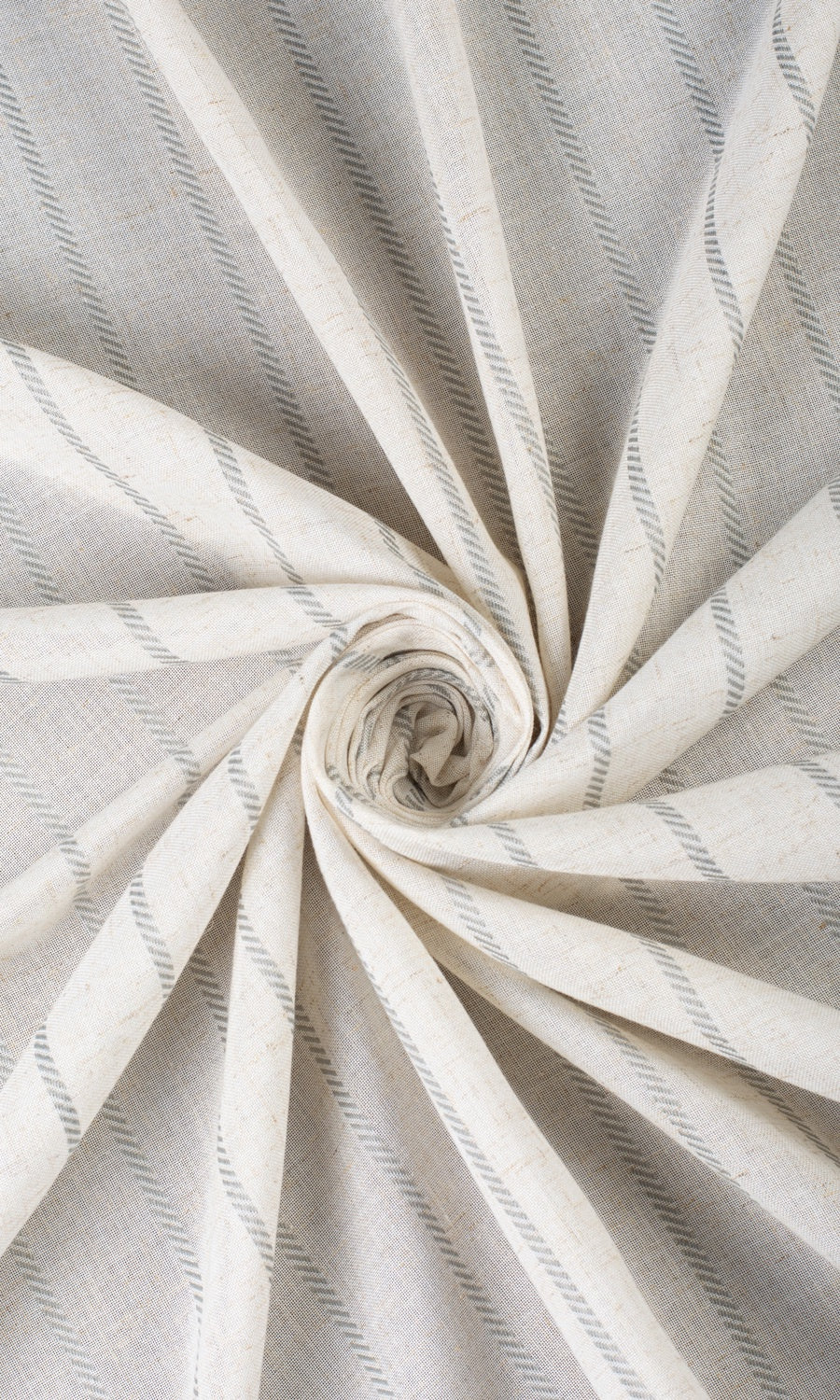 A lovely warm white linen sheer that offers a one-of-its-kind elegance with its gray stripes. Slight indulgence in color and pattern and a ton of slubbed texture proffer a rich personality while keeping to a minimal appeal. Dress a modern home that loves a pinch of color with 'Pebble Whisper' while being assured of a wrinkle-free sleek aesthetic by the lasting partnership of linen and polyester.