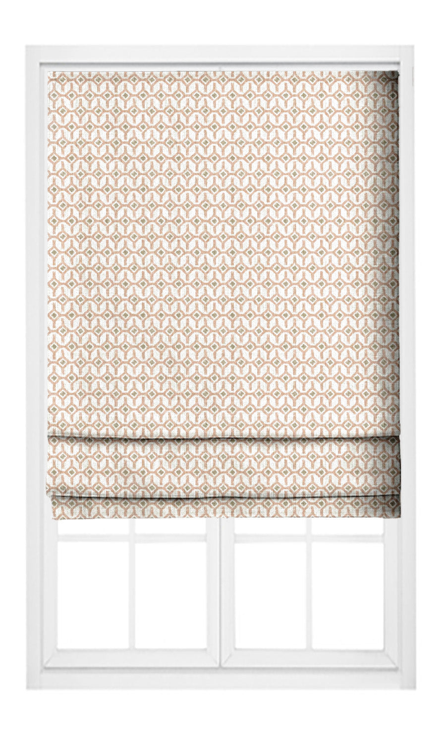 - Crown with a plain valance: Layer these roman shades with a plain blush pink valance to ground their intricate trellis pattern. This interplay of solids and prints brings depth and interest to the arrangement, and makes it feel more tailored and considered.