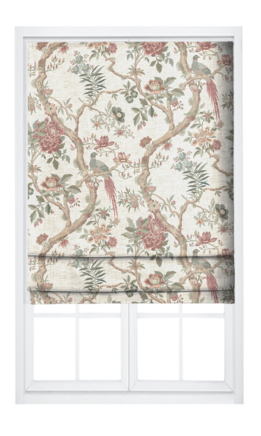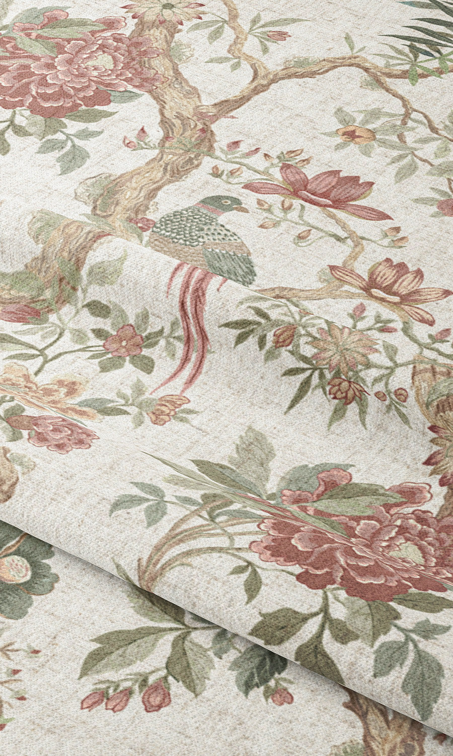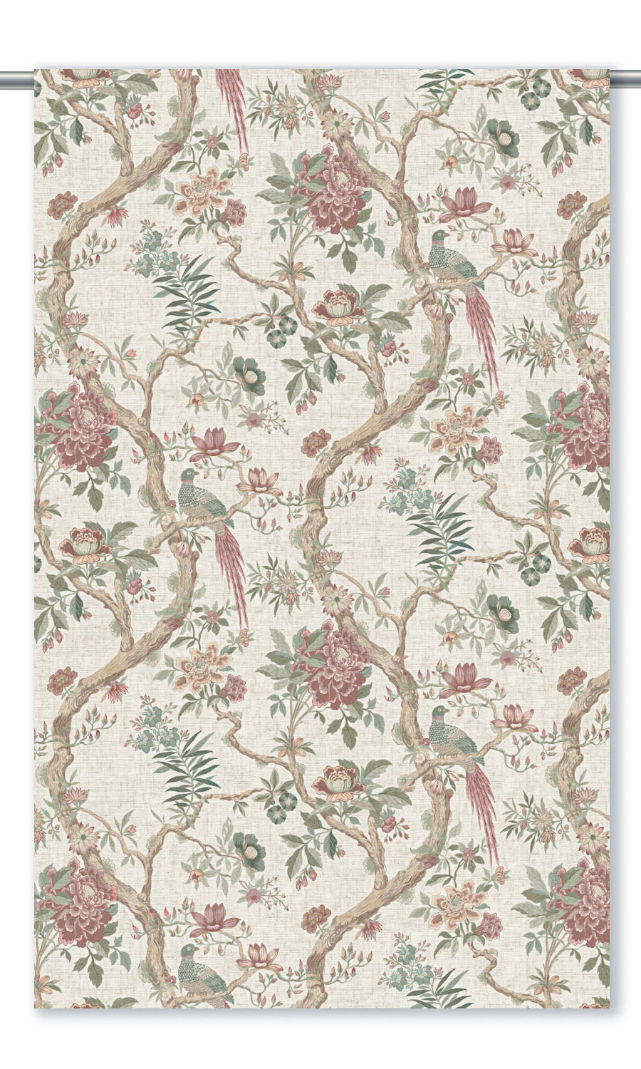 • Blush pinks, soft maroons, and sage greens evoke the quiet poetry of a blooming garden on a serene cream canvas