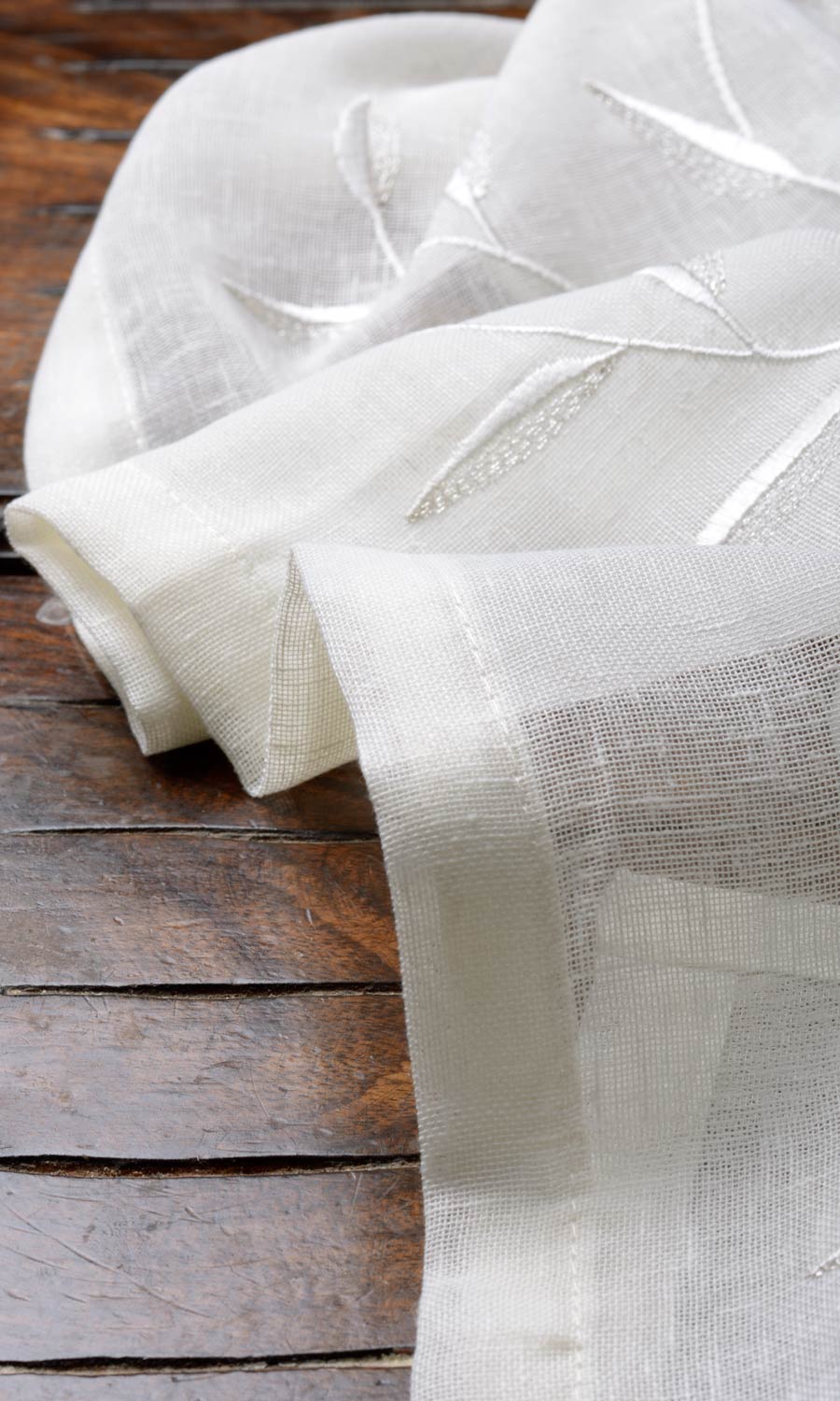 Casual and chic, this white sheer drapery fabric is for those who want to welcome light into their homes in remarkable style. Delicate sprigs in lustrous white embroidery express the nature theme with tone-on-tone elegance. As the sun rays seep into the home through the linen-like slubs, the space gets anchored in a relaxed mood. Style it in rod pocket or back tab curtains, or relaxed roman shades to get the most elegant look of this gorgeous fabric.