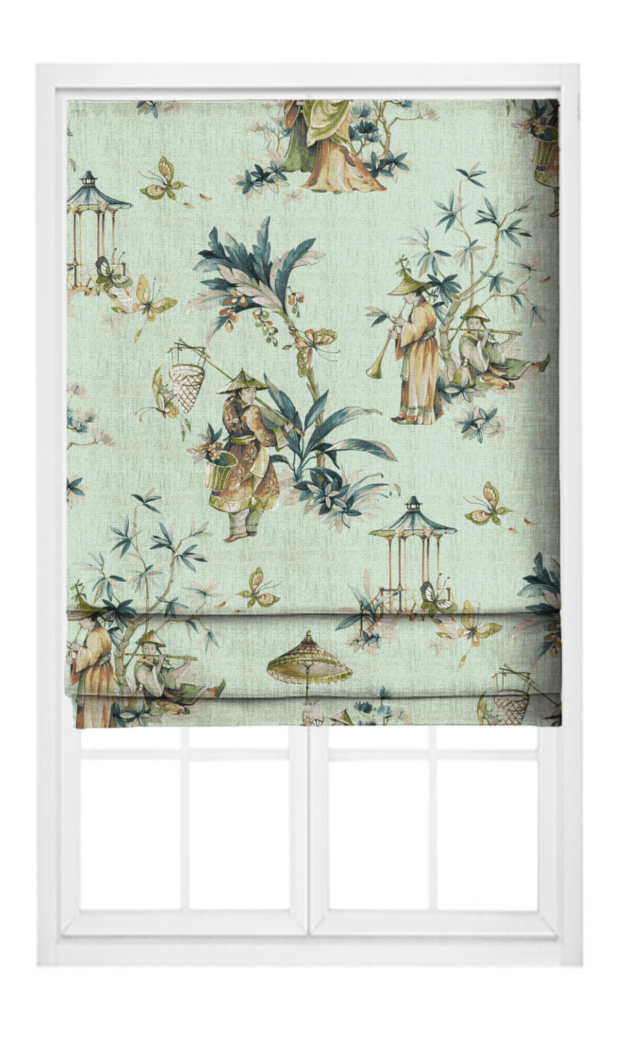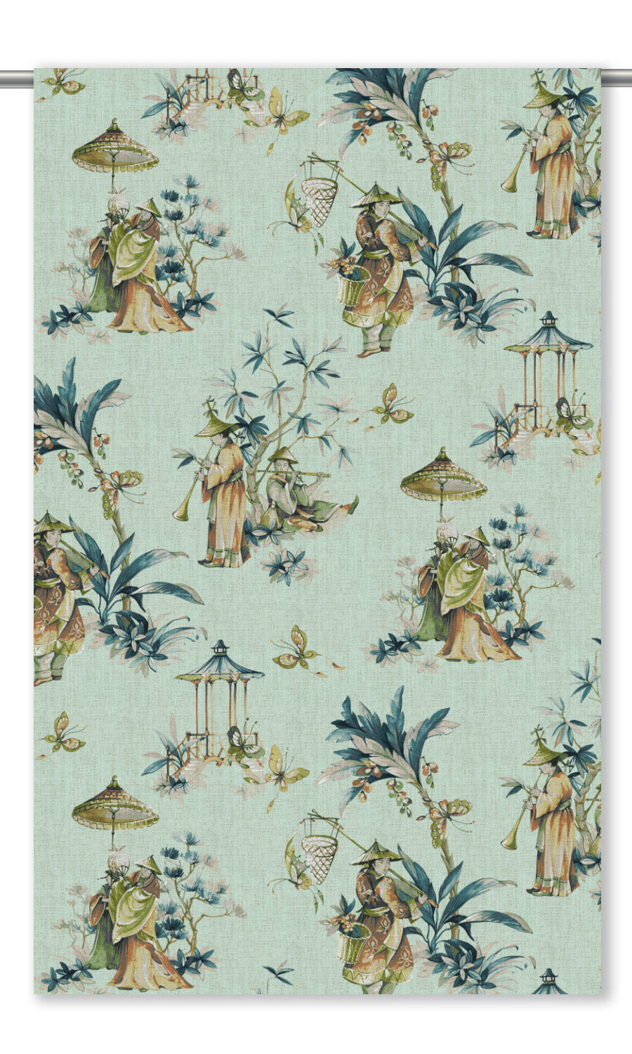 Its charming chinoiserie print depicting delicate vignettes of life and labor, where musicians and harvesters in traditional attire animate a serene Asian landscape
