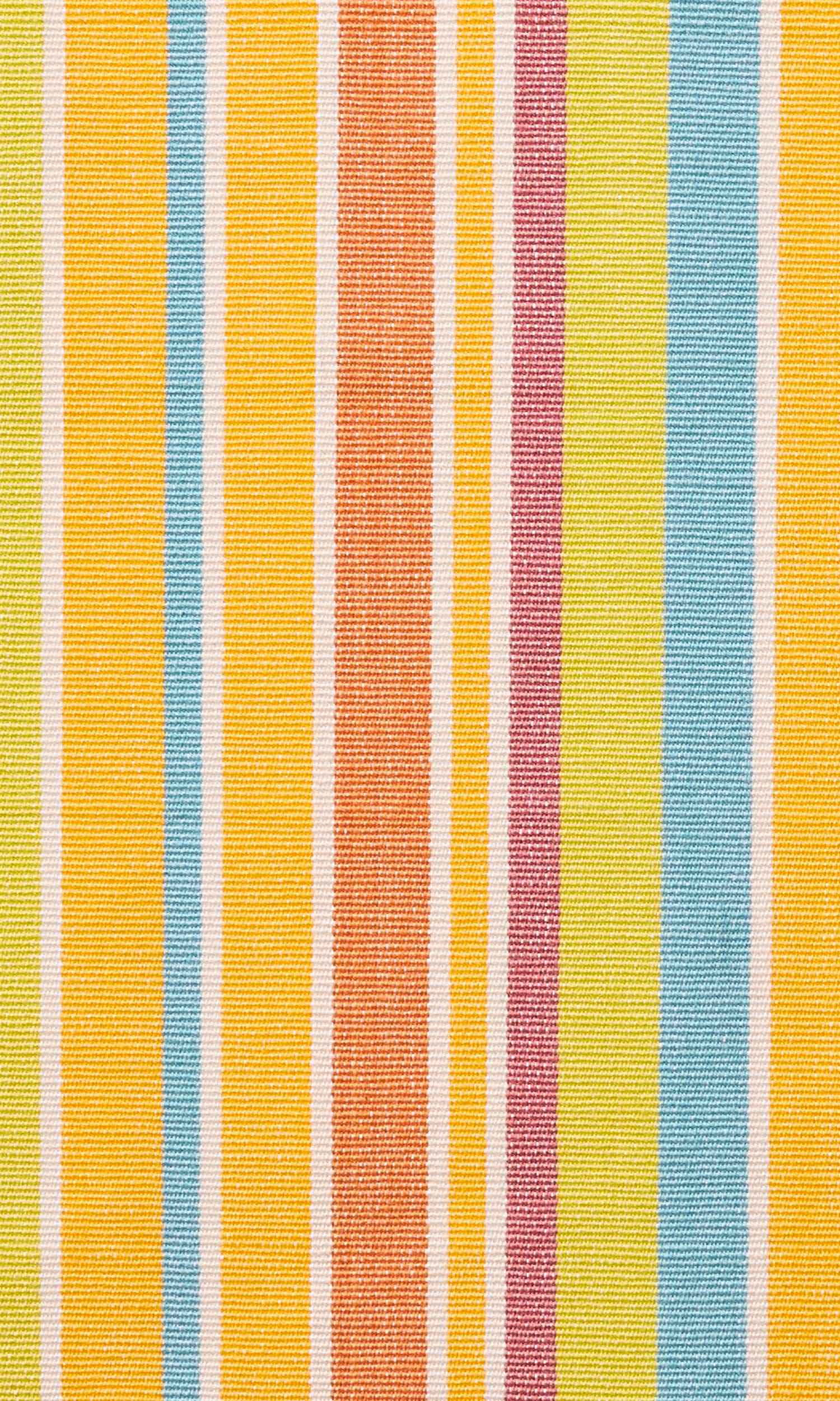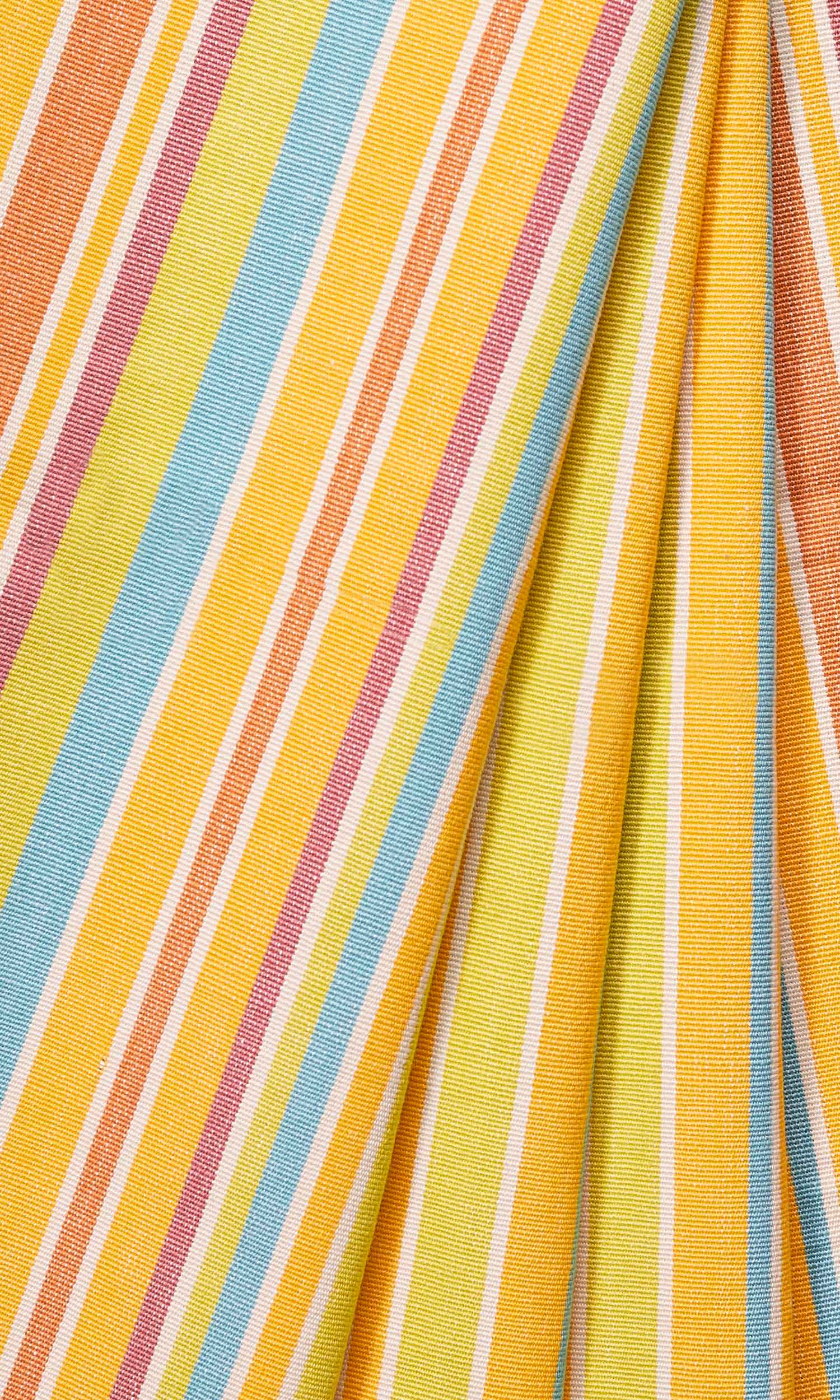 A cheerful cotton fabric featuring a deep hue of yellow interlaced with colorful stripes of blue, white, orange and purple.
