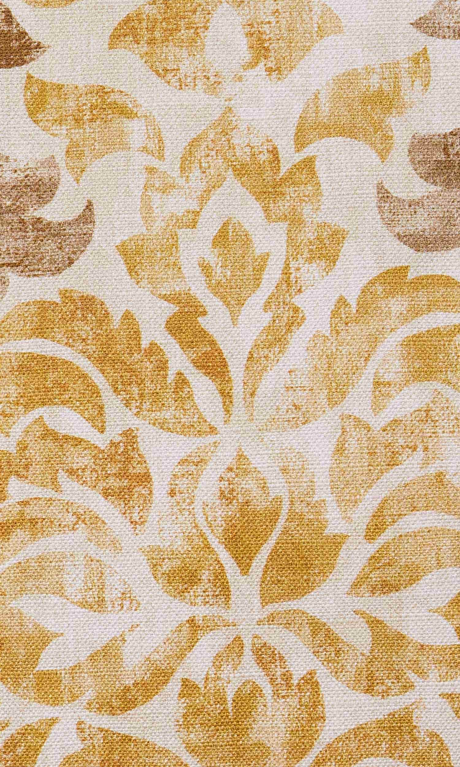 An utterly elegant fabric to create a feeling of warmth and welcome in your space. Its glowing ocher yellow and mocha color combination is inspired by an earthen palette. The faux stencil floral-foliage print and alternating columns adds further charm.