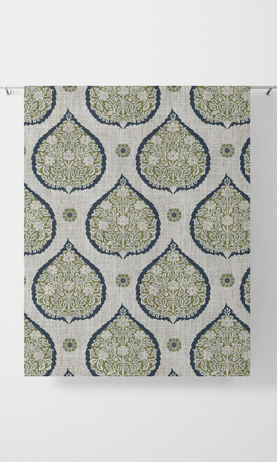 If you love the delightful medley of old and new, this fabric featuring the ancient Moghul motif in a sophisticated navy blue and green palette is a must-buy. Grand cordate leaves engraved artfully with the narcissus shrub and juxtaposed with tiny flowers make for an arresting paisley-inspired window dressing. The scaling and the delicate intricacy doubly ensure that you’re signing in for a statement piece. And what better way to show off your love for oriental vintage art!