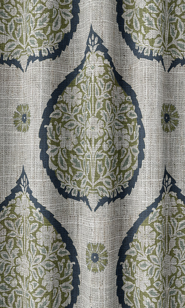 If you love the delightful medley of old and new, this fabric featuring the ancient Moghul motif in a sophisticated navy blue and green palette is a must-buy. Grand cordate leaves engraved artfully with the narcissus shrub and juxtaposed with tiny flowers make for an arresting paisley-inspired window dressing. The scaling and the delicate intricacy doubly ensure that you’re signing in for a statement piece. And what better way to show off your love for oriental vintage art!