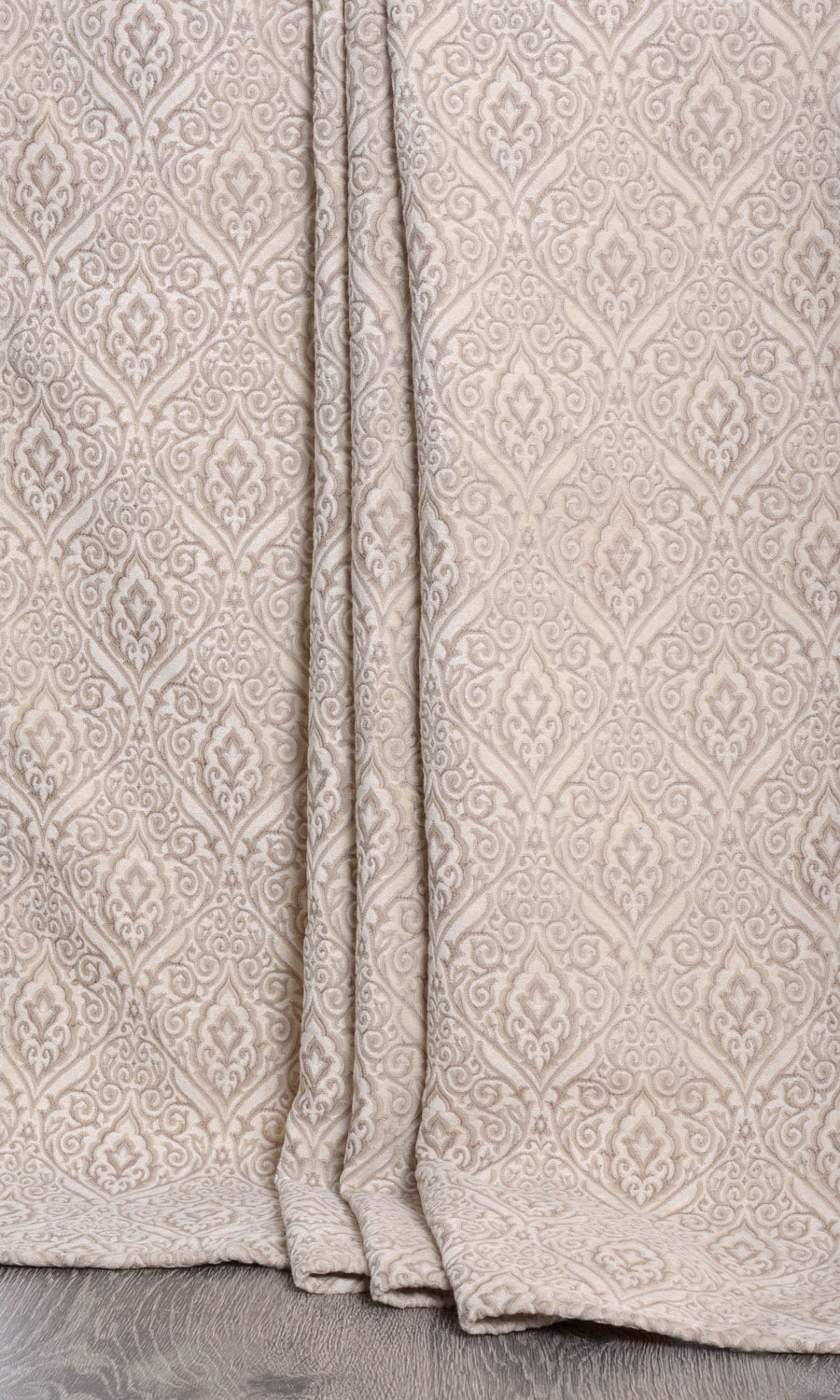 Looking for a dreamy look with traditional undertones? This is the drapery you need on your windows. Elegantly patterned in a graceful vine motif, it looks spectacular in soft hues of ivory and beige. These pretty as picture made-to-measure velvet window curtains/drapes will invite envious glances from your guests.