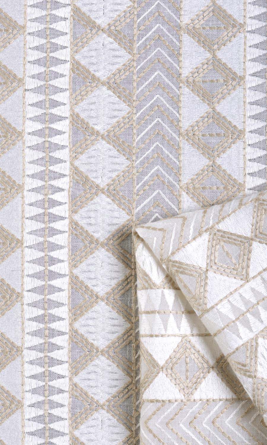 Blending traditional embroidery with a contemporary color palette in white, gray and beige. The basic fabric is the palest gray that's covered with an embroidered geometric pattern rich in straight lines, triangles and angles. While most of the embroidery is white, it has been highlighted in beige to resemble the traditional kantha embroidery from India. To sum it up; Quench Quest is a cut above the rest.