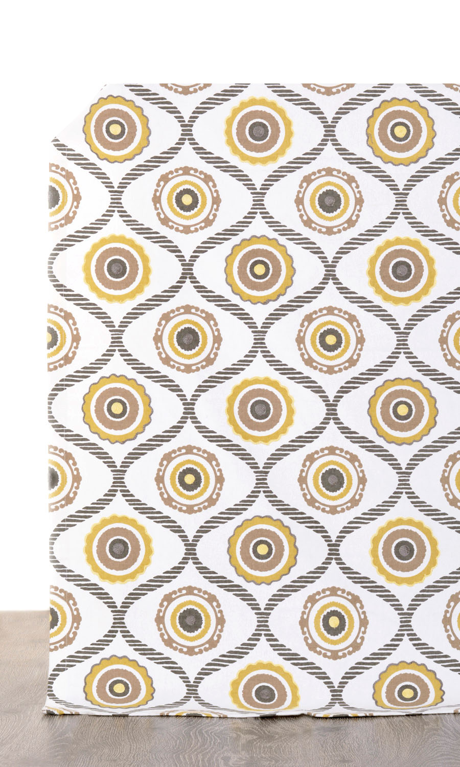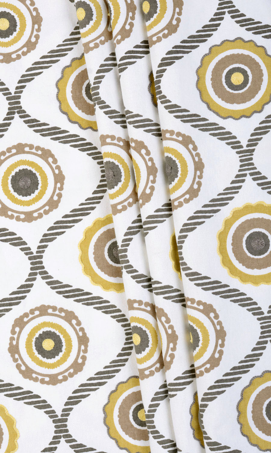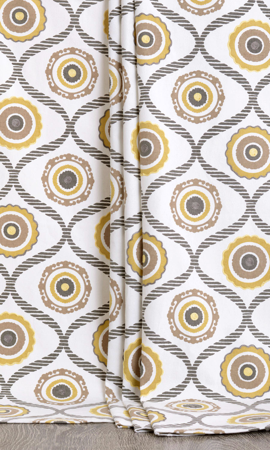 When designing Quirky Quest, we imagined that we were taking dots and spots and waves to a joyful journey. This 100% pure cotton fabric has a white base with slate gray waves made up of parallel chunky lines. In between the touching crests and troughs of waves are rough circular motifs in ochre yellow, slate gray and cinnamon brown. The overall feel is of happiness tinged with innocence. Perfect for family space drapery!