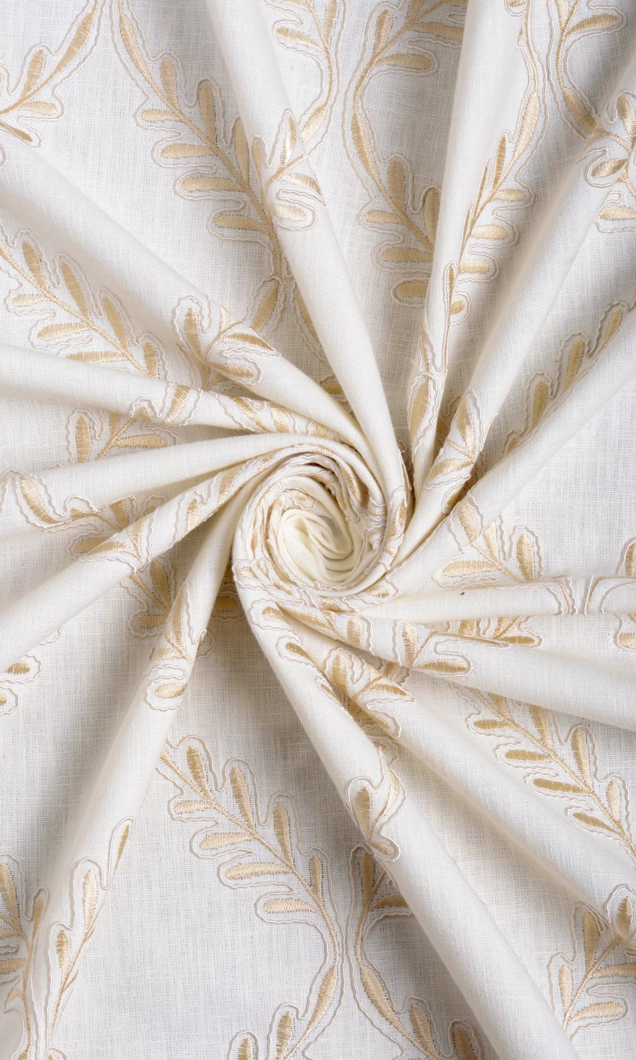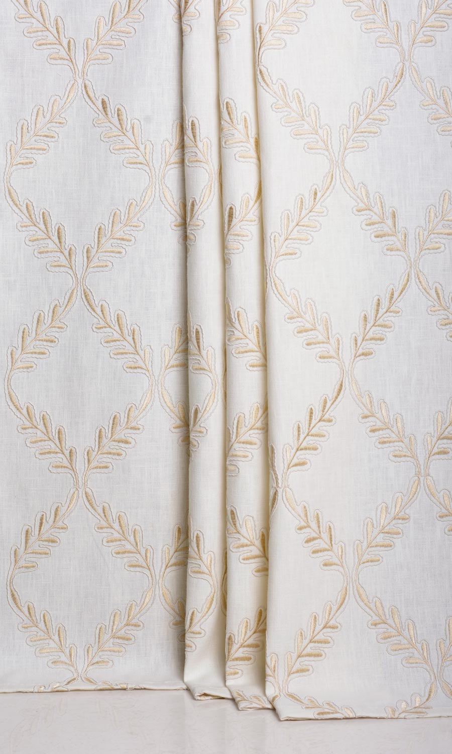 Those who love geometric patterns as passionately as floral designs can now gratify their design aspirations in this linen-blend. Slender sprigs move rhythmically from top to bottom caving in at intervals to form a harlequin pattern. Window treatments in this white fabric with delicate beige embroidery make a gorgeous visual treat with subtle contrasts.