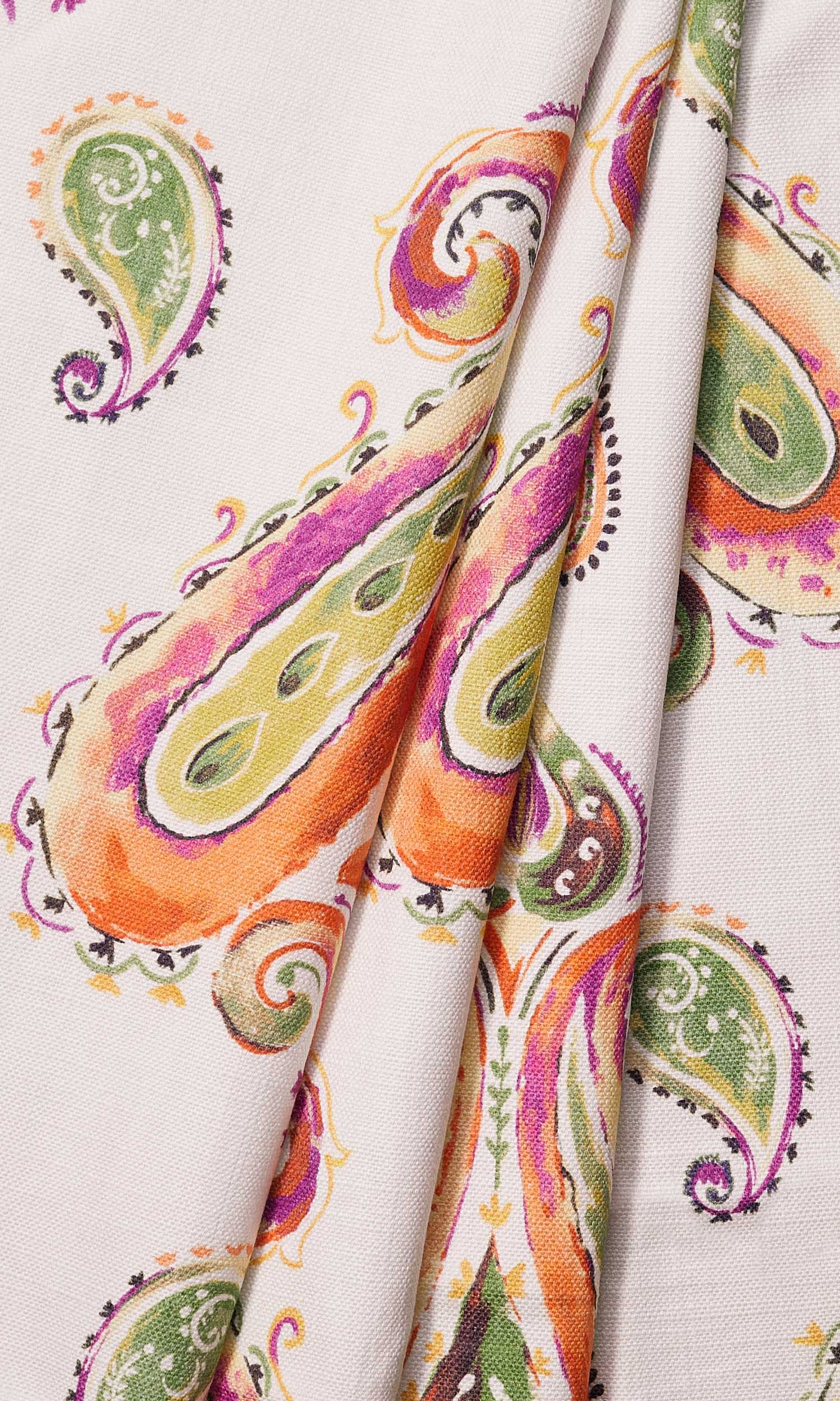 Who says paisleys and modern decor don't go together! Check out this vibrantly colorful fabric with its moss green and tangerine orange paisley print. The entire look is made even more stunning by dark highlights and pristine white backdrop. Totally eye catching, really chic!