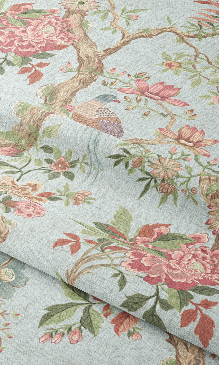 - Blush pinks, soft browns, and olive greens evoke the quiet poetry of a blooming garden on a whimsical powder blue canvas