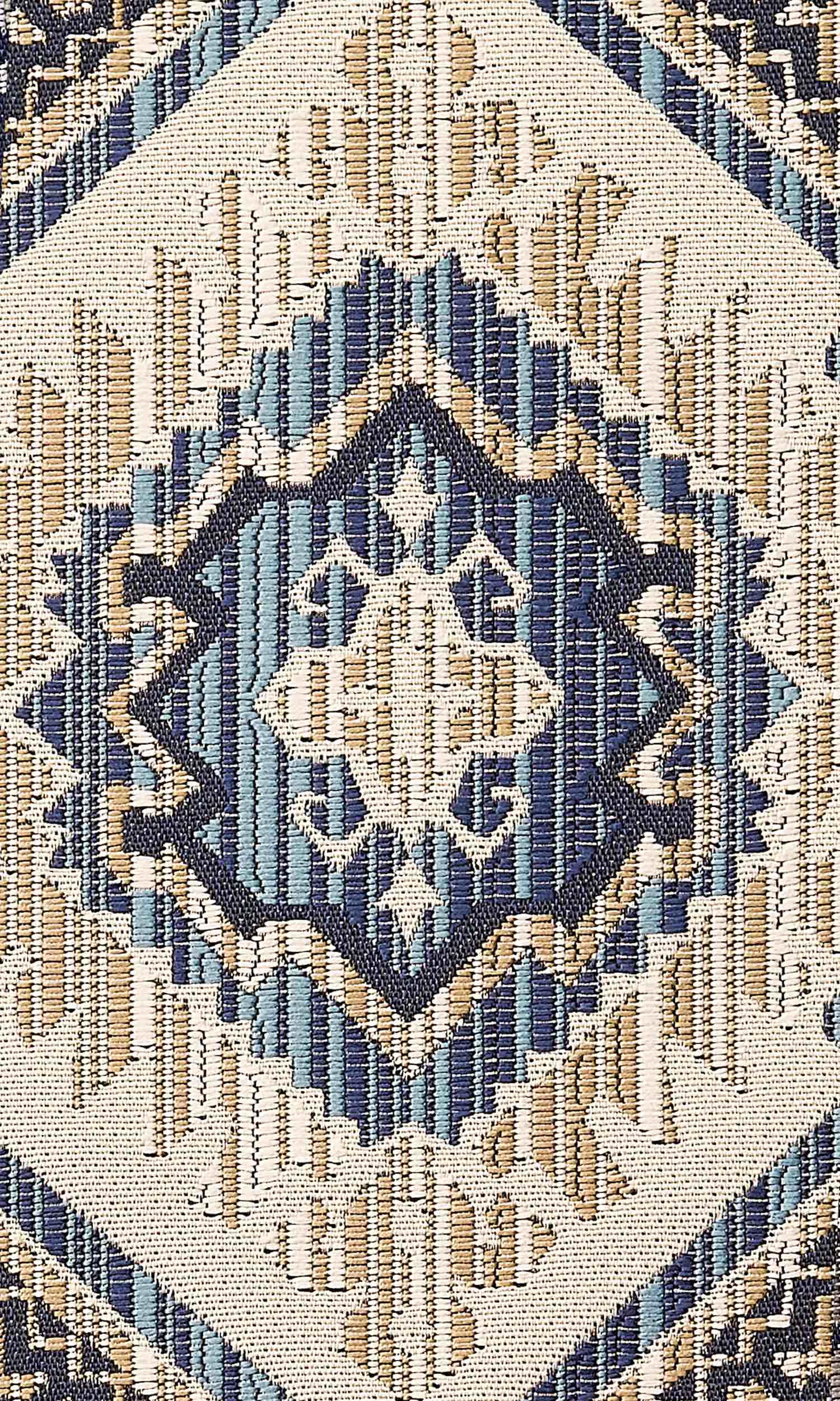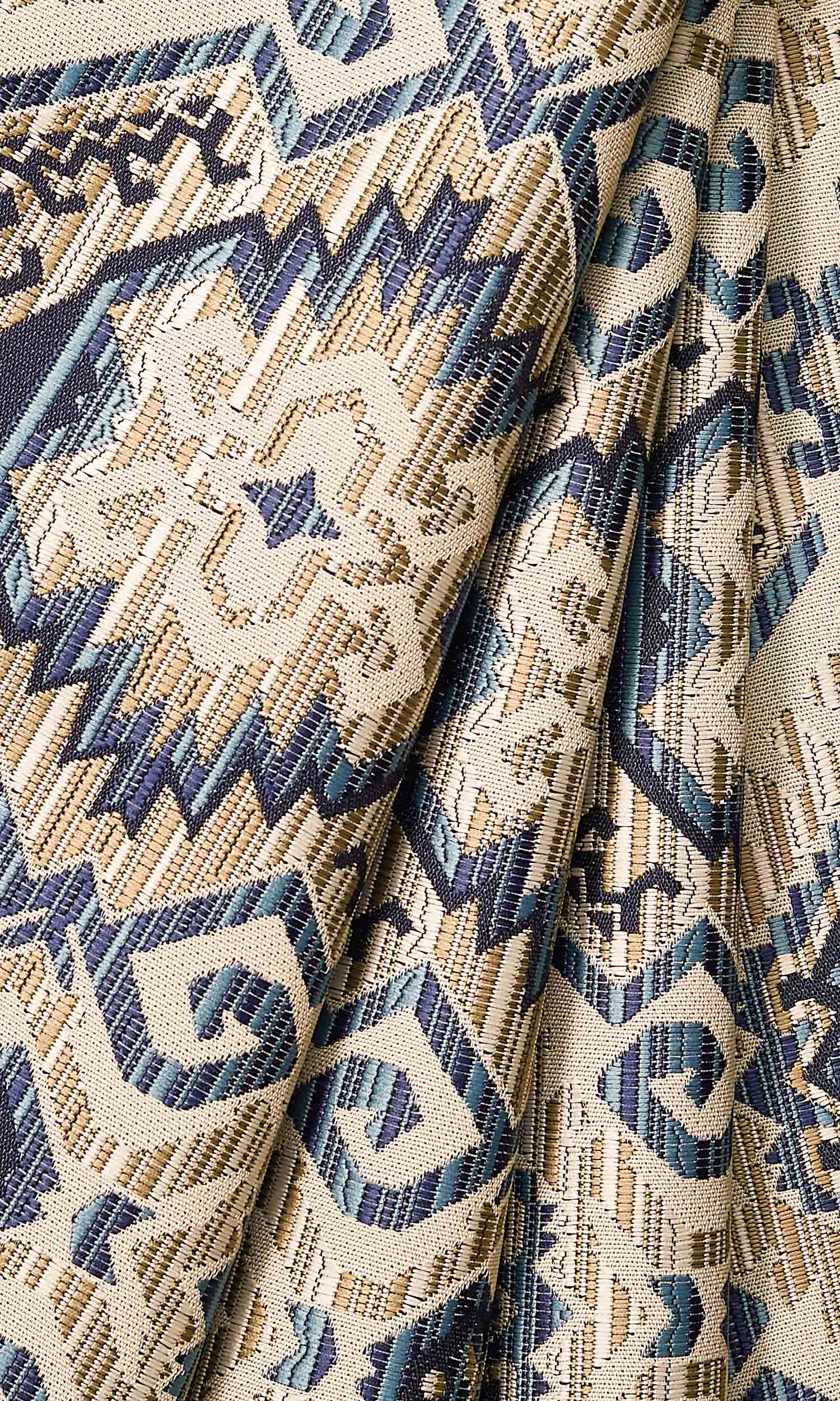 This elegant fabric features an intricate jacquard weave in striking colors of pale beige, sky blue and navy blue on a white backdrop. The eye-catching native Red Indian motif in hues of 'earth and sky' creates a stunning visual vignette.