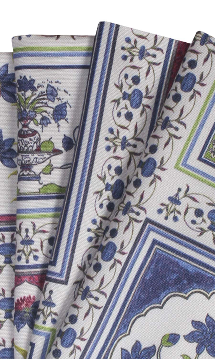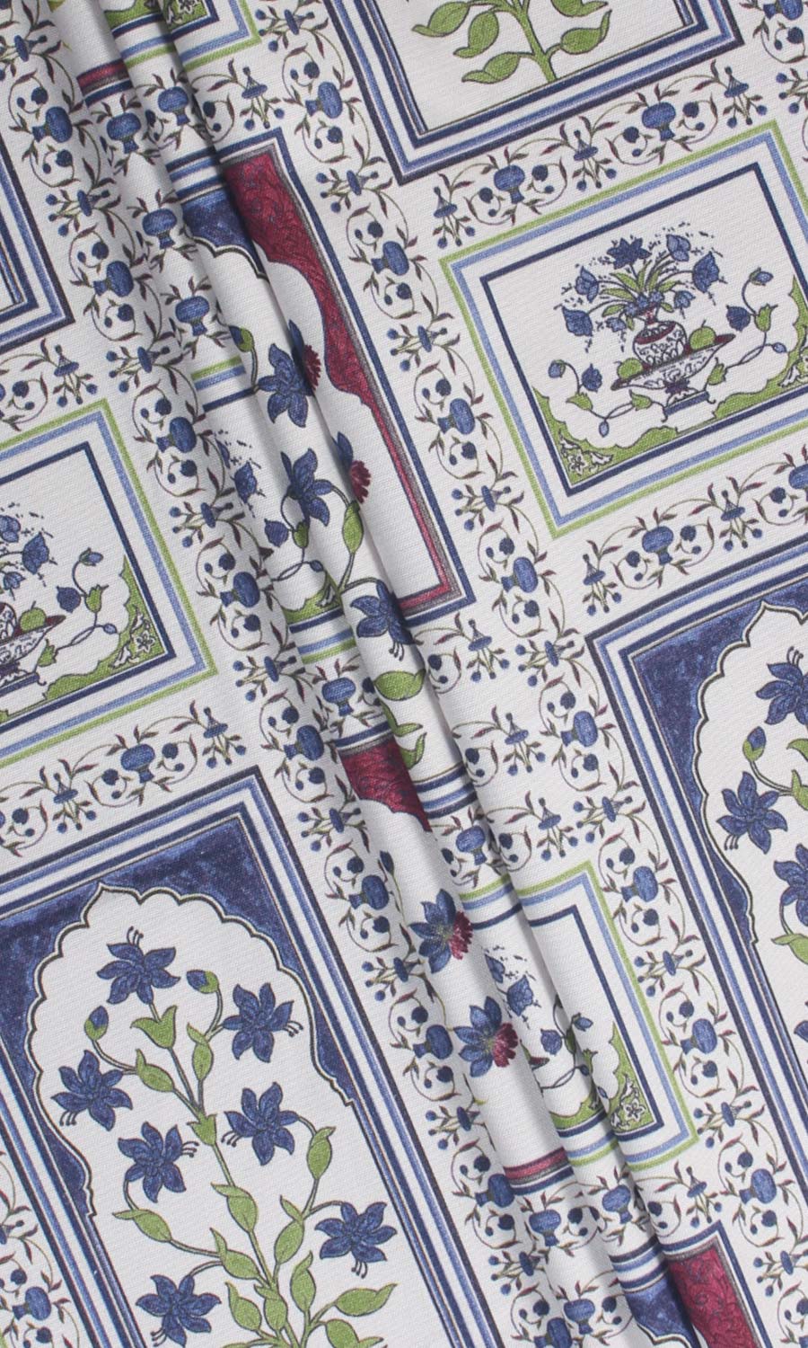 Oriental theme in a classic color scheme. Roopkund offers a sneak peek into India's extravagantly detailed art forms and architectural marvels. It combines the florid beauty of Mughal-style hand-painted floral designs and intricately embellished 'jharokhas' - the ornate oriel windows of classical Indian architecture. Add an eclectic dimension to your decor with window treatments crafted from this exotic cotton fabric.