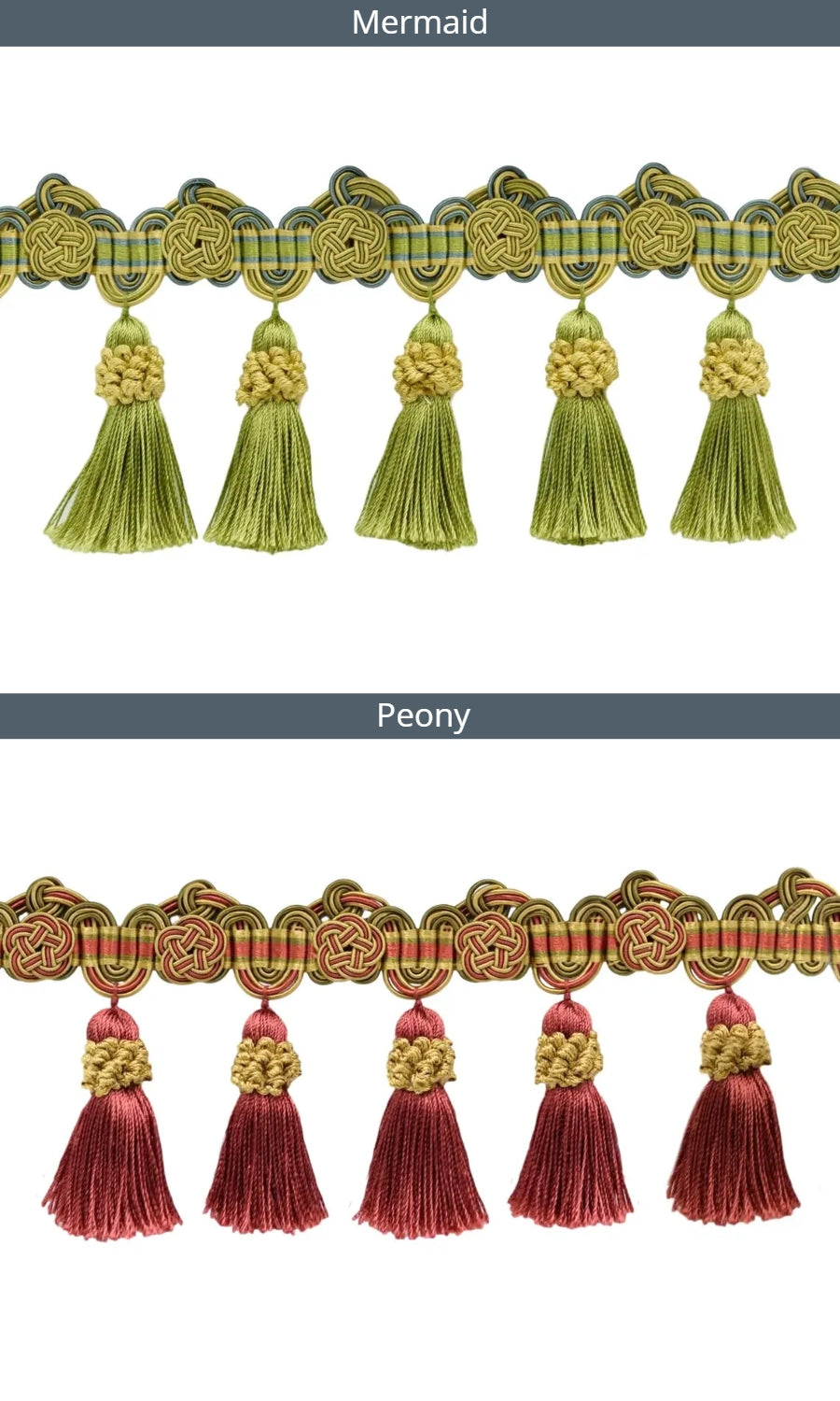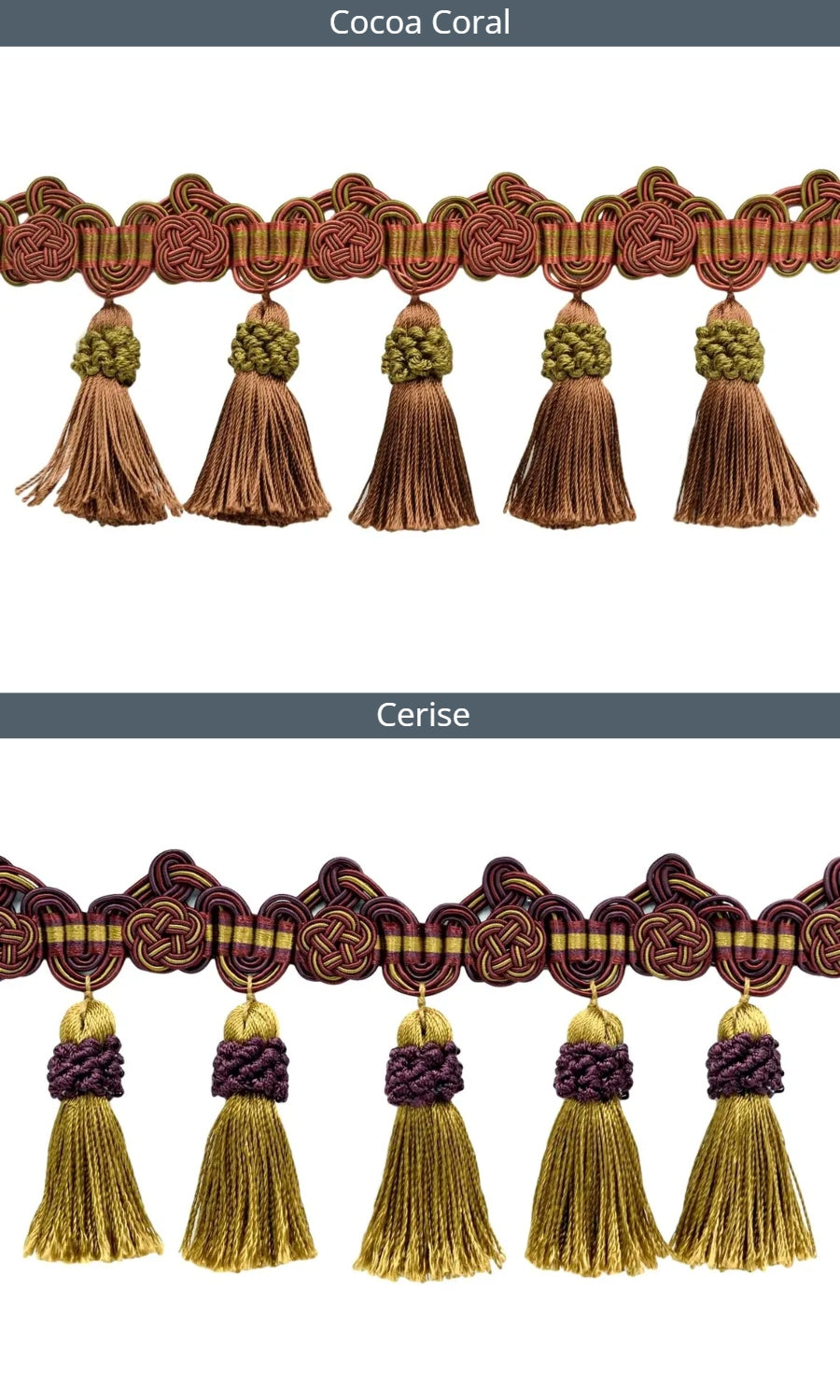 This ornate tassel trim measures 3-3/4 inches (95mm) from top to bottom, and is available in 4 colorways.