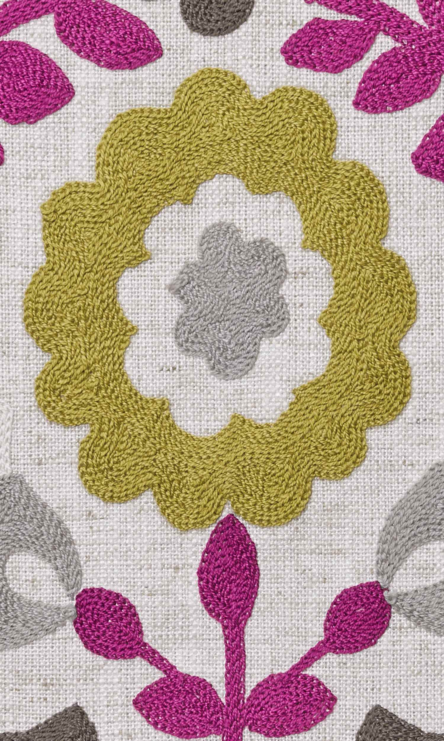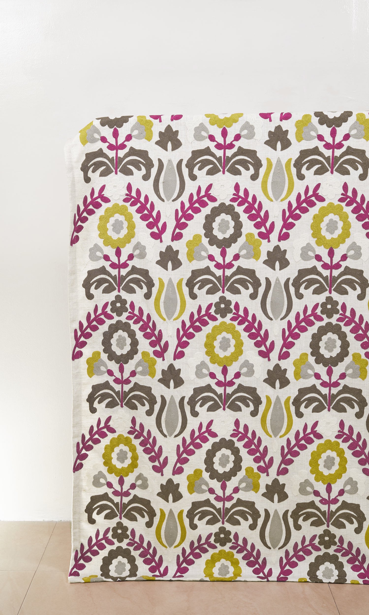 Create the perfect room look with this bright and breathtakingly beautiful fabric. It is embroidered in crewel stitch with a gorgeous folksy floral motif. A simple white backdrop offsets brighter hues of embroidery threads - magenta, pale gray, soot gray and mustard-green - to striking effect. This fabric looks ultra good in pinched pleat style curtains, especially when hung in bohemian and shabby chic inspired rooms.