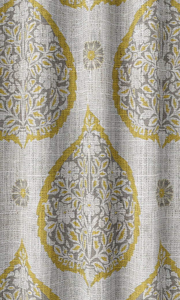 Welcome home a marvel from traditional Indian art with this classic fabric featuring ancient Mughal motifs in a modern palette of gray and lemon yellow. Large cordate leaves interspersed with tiny scattered blooms offer an intriguing contrast of proportions while the narcissus shrub enclosed within the leaf delivers intricacy with sophistication. Window treatments in this paisley-inspired fabric are self-assured statement pieces.