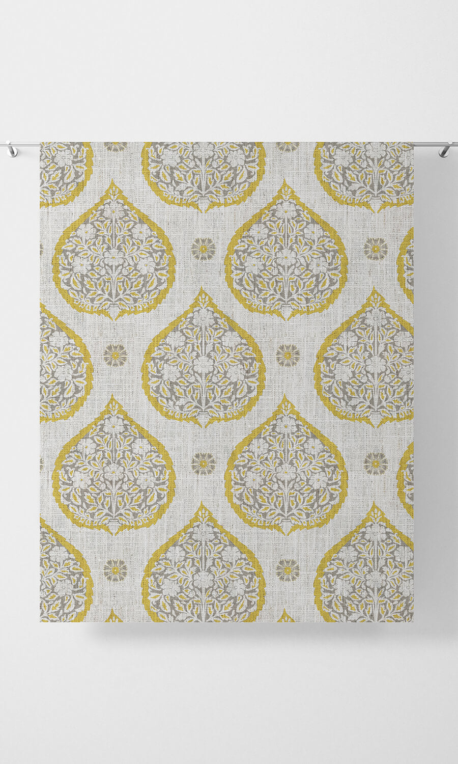 Welcome home a marvel from traditional Indian art with this classic fabric featuring ancient Mughal motifs in a modern palette of gray and lemon yellow. Large cordate leaves interspersed with tiny scattered blooms offer an intriguing contrast of proportions while the narcissus shrub enclosed within the leaf delivers intricacy with sophistication. Window treatments in this paisley-inspired fabric are self-assured statement pieces.