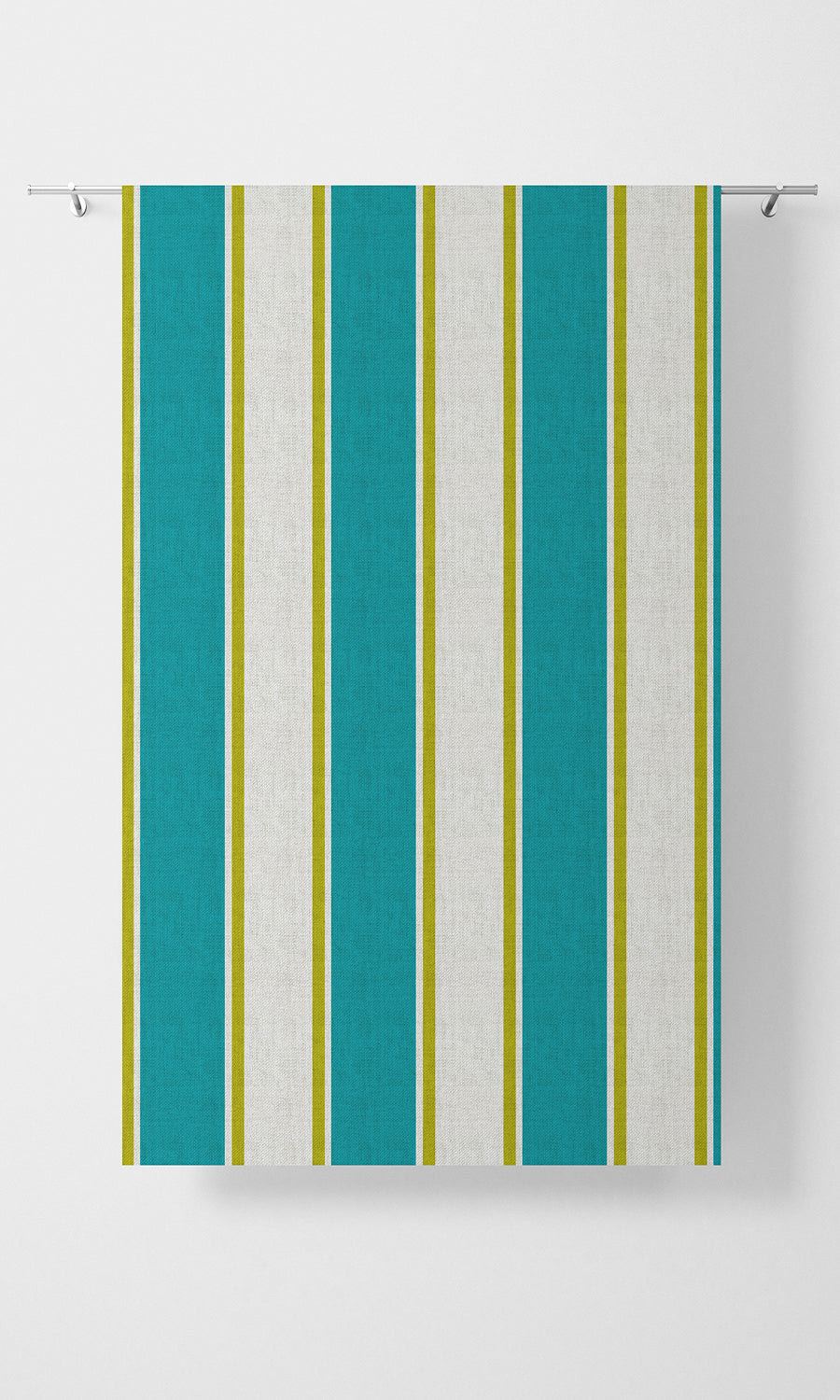 Featuring the most cheerful palette, this stunning fabric is made for cozy kitchens and lively dining rooms. It boasts a trend-right colorway of pacific blue, apple green and linen white, complemented by a bold pattern of wide and slender repeating stripes. Its blue lends it a pop of pizzazz, but not so much to detract from other elements at play in your decor. Its designer flair makes it suited to upscale looks as well as relaxed, contemporary settings.