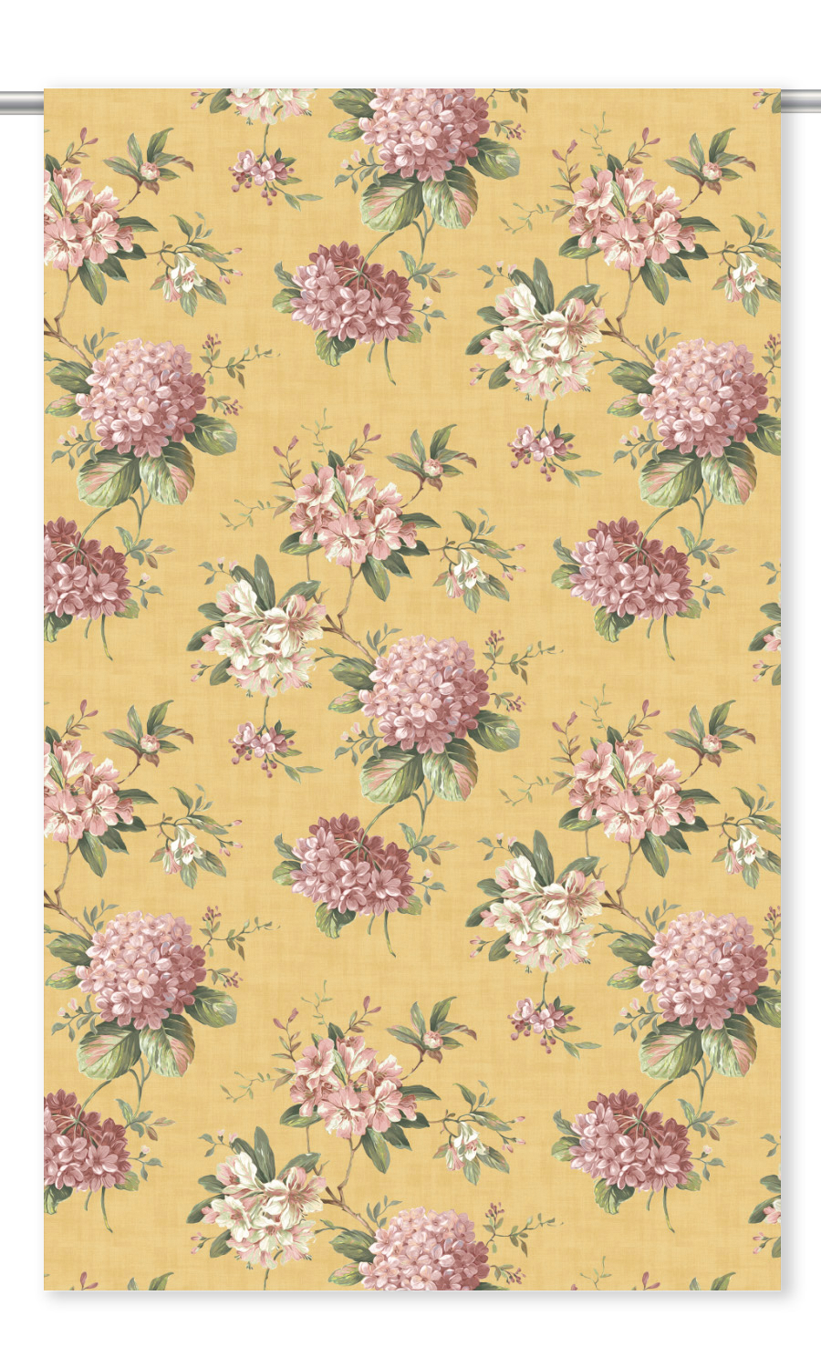 • The dance of blush pinks and pale greens on lively yellow, echoing the poetry of a garden in full bloom
