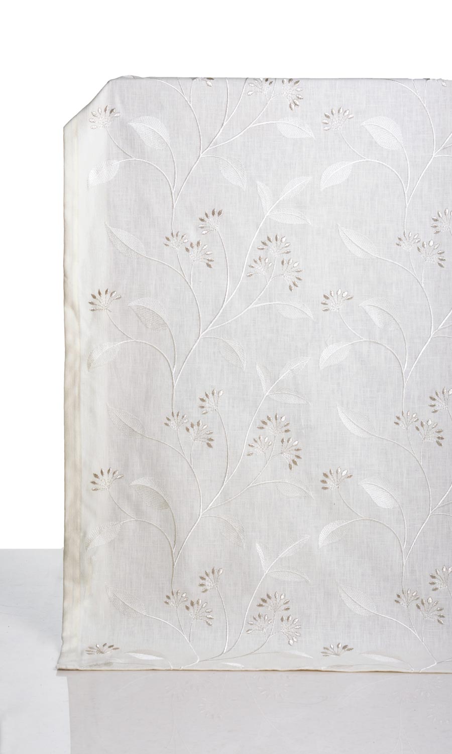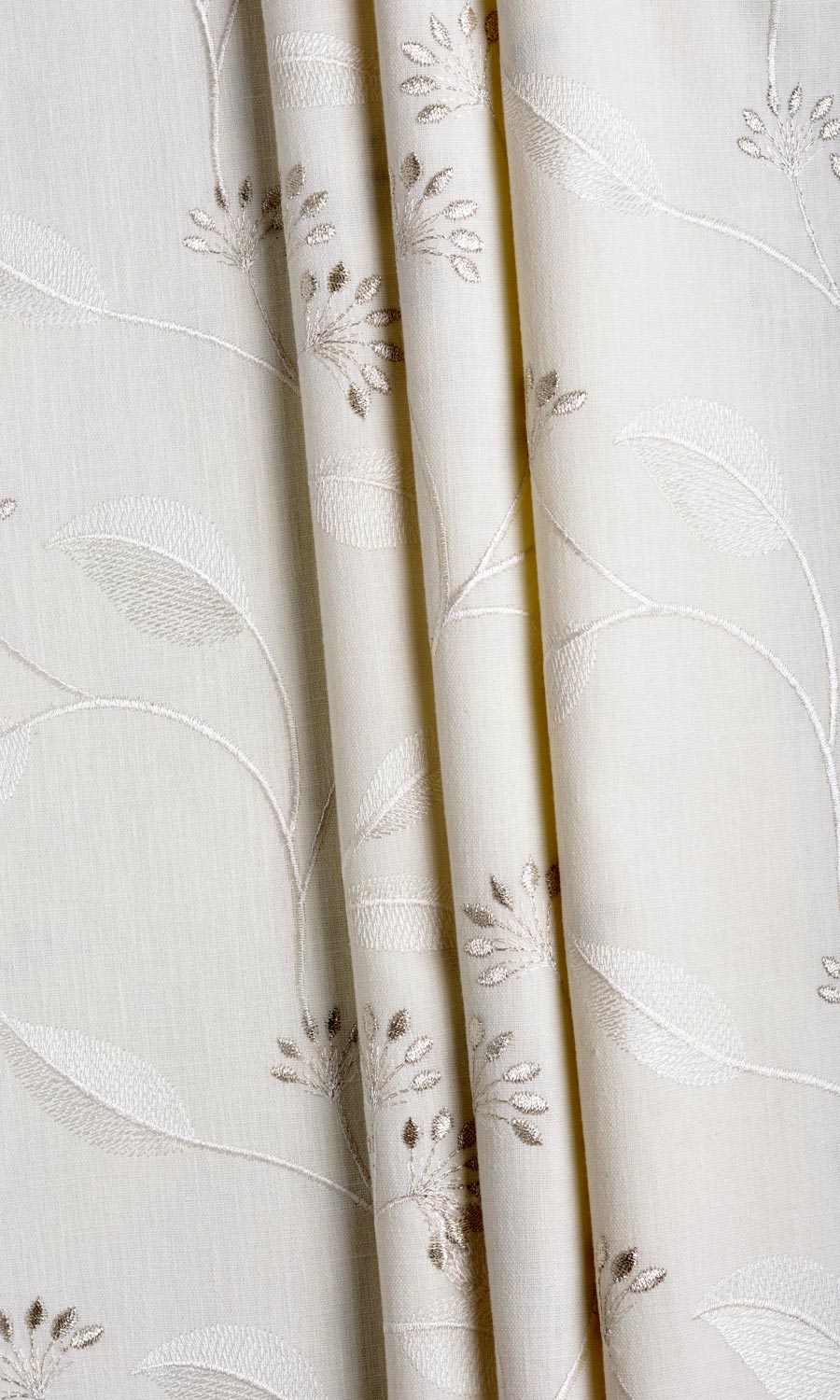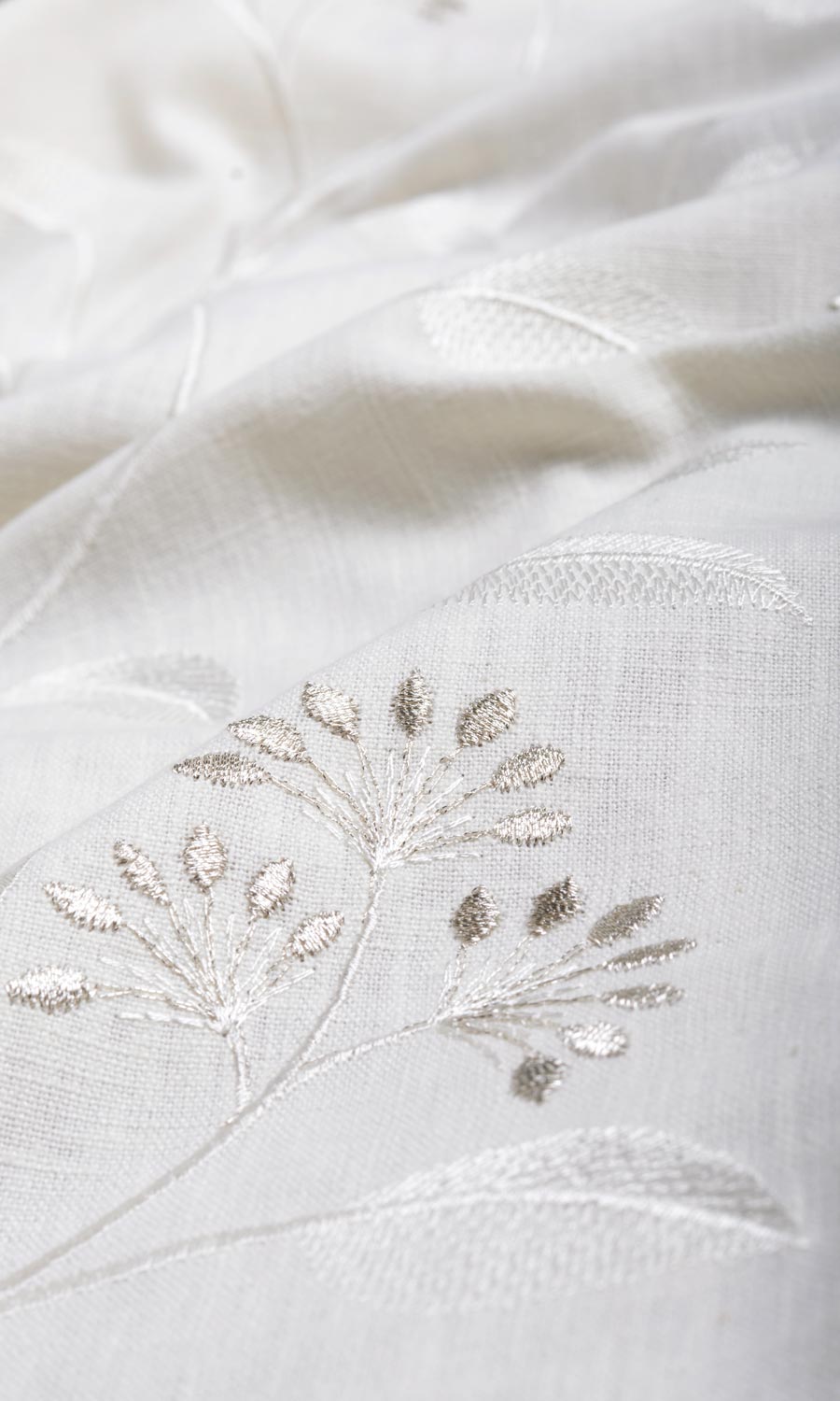 Speaking more with few words, this cream drapery fabric presents floral motifs with subtle contrasts and artistic finesse. Leaves and blooms on slender stalks, embroidered delicately in tones of white, give off the sophisticated flair of the nature theme impressively. The neutral palette ensures easy blending with diverse color schemes and decor styles.