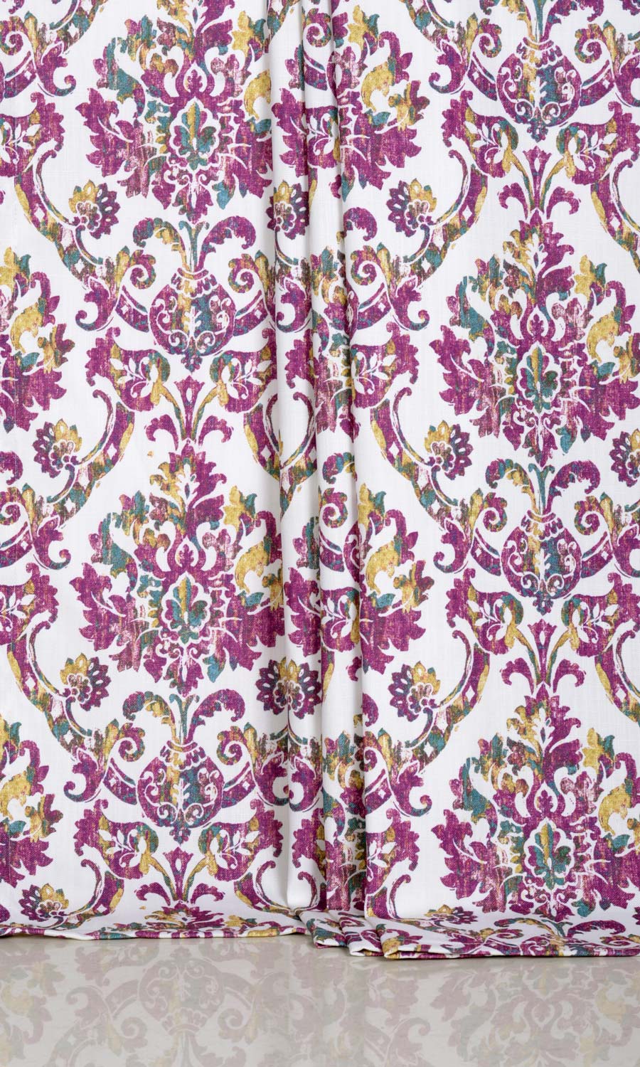 If intricate detailing moves you, you can’t walk past this jaw-dropping damask fabric! A generous helping of magenta purple and tinges of gold and teal blue make sure that this window treatment will be a conversation starter for your visitors. Classically-styled extra-large living rooms and open-plan homes stand to benefit immensely from such bold-patterned drapes and roman shades.