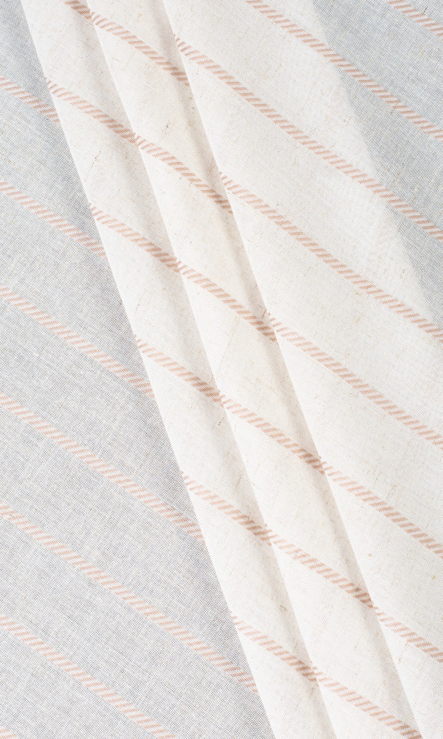 A lovely warm white linen sheer that offers a one-of-its-kind elegance with its salmon pink/red stripes. Slight indulgence in color and pattern and a ton of slubbed texture proffer a rich personality while keeping to a minimal appeal. Dress a rustic home, a country kitchen or even a modern home that loves a pinch of color with casual charm while being assured of a wrinkle-free sleek aesthetic by the lasting partnership of linen and polyester.