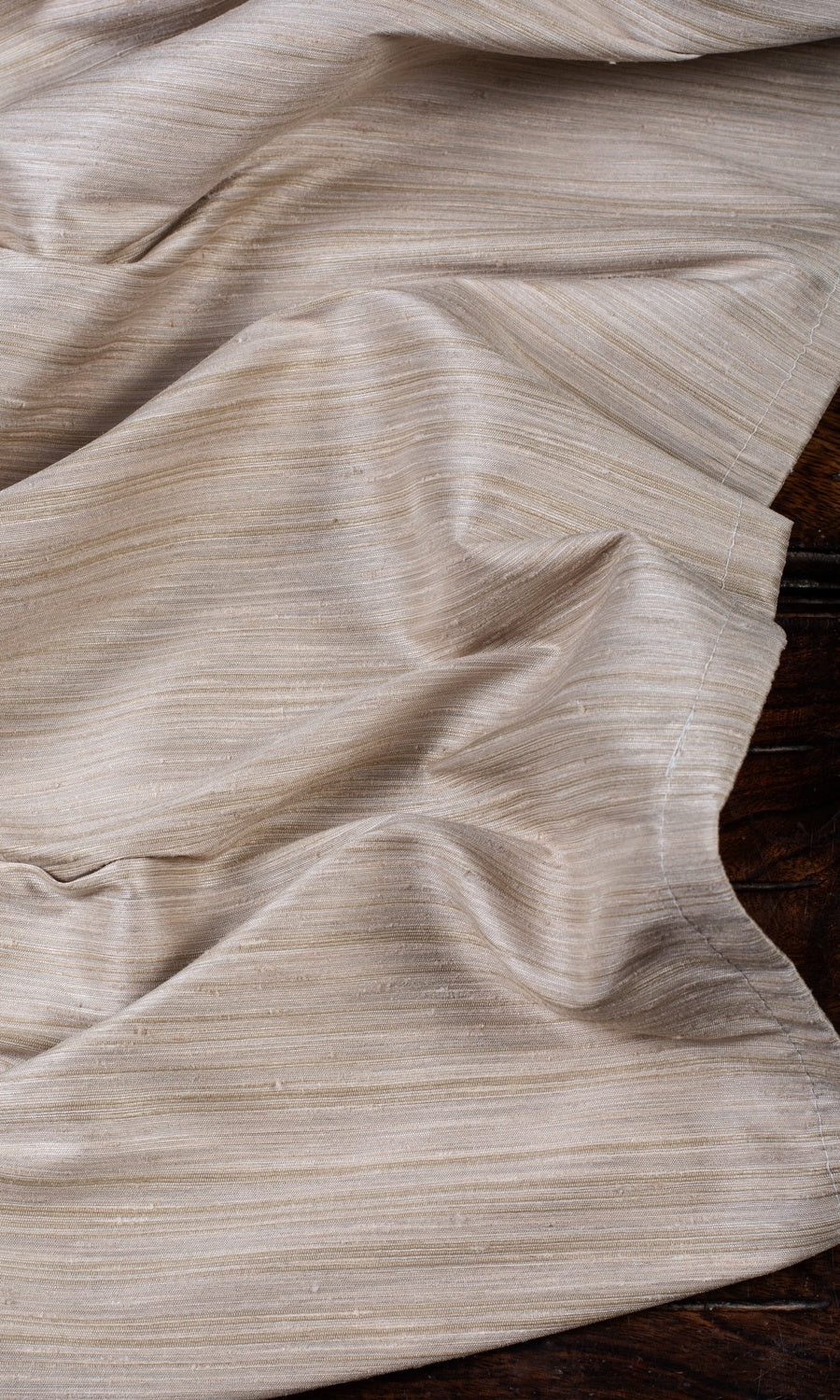 Reminiscent of the softness and earthiness of coastal sands in its ivory & beige palette, Sheer Style is for the ones with a taste that leans towards the serenity of understated hues and the delicate subtlety of woven textures. The striated pattern and slubby texture add a subtle element of visual interest to this faux silk while the overall vibe is one of silent restfulness. Its versatile and quiet pattern lends you an excuse to add color to a neutral-hued modern home or pattern to a minimalist space with subtlety.
