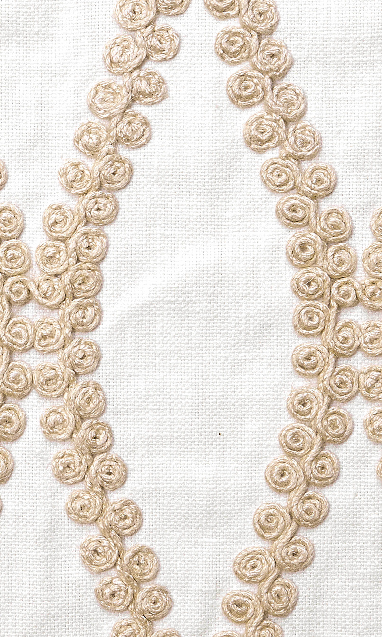 This exquisite fabric is embroidered with an exquisite vertical wave pattern made up of numerous double spirals. The alternate placement of waves creates a trellis like illusion. A luxurious gold and white color scheme adds rich and exclusive look.