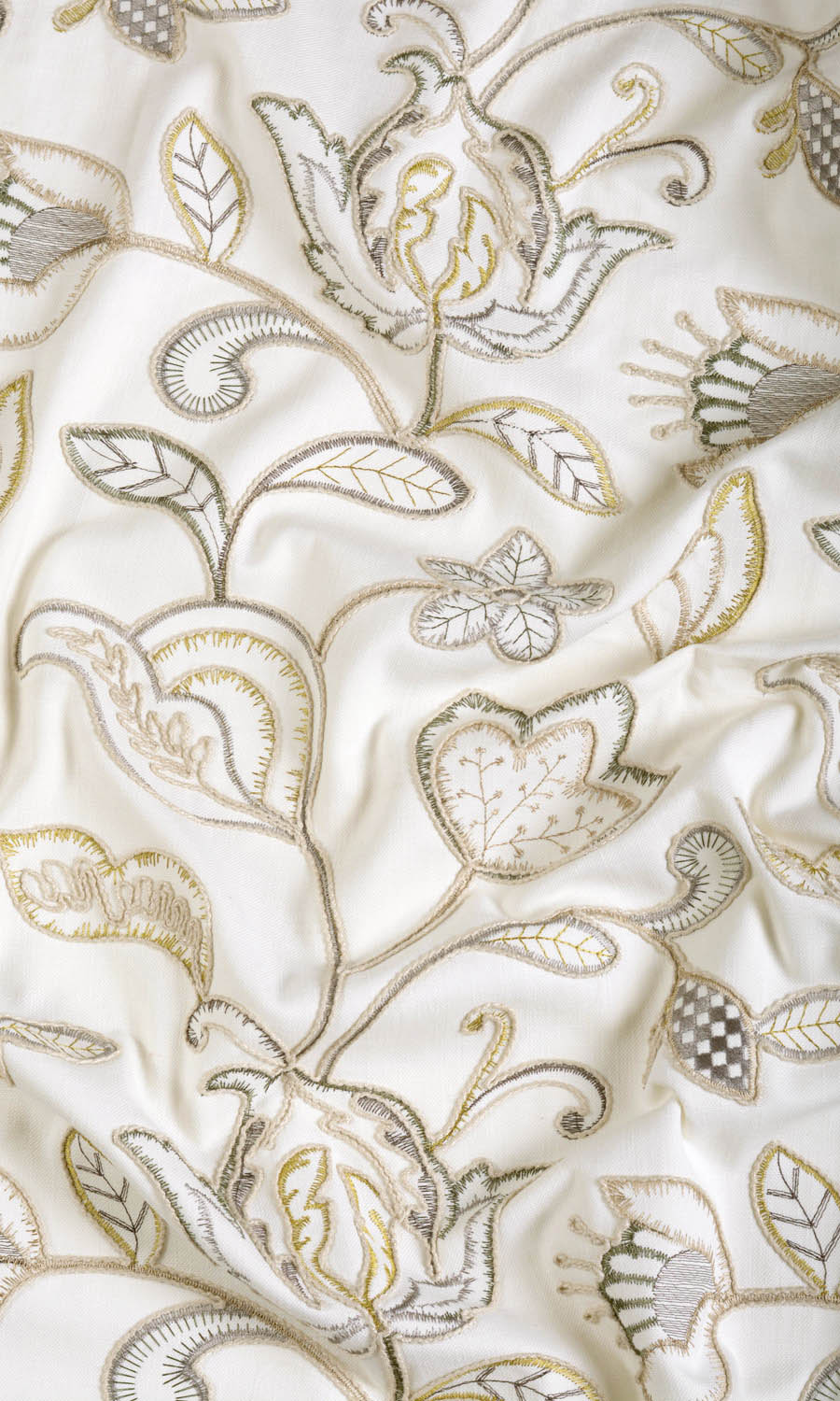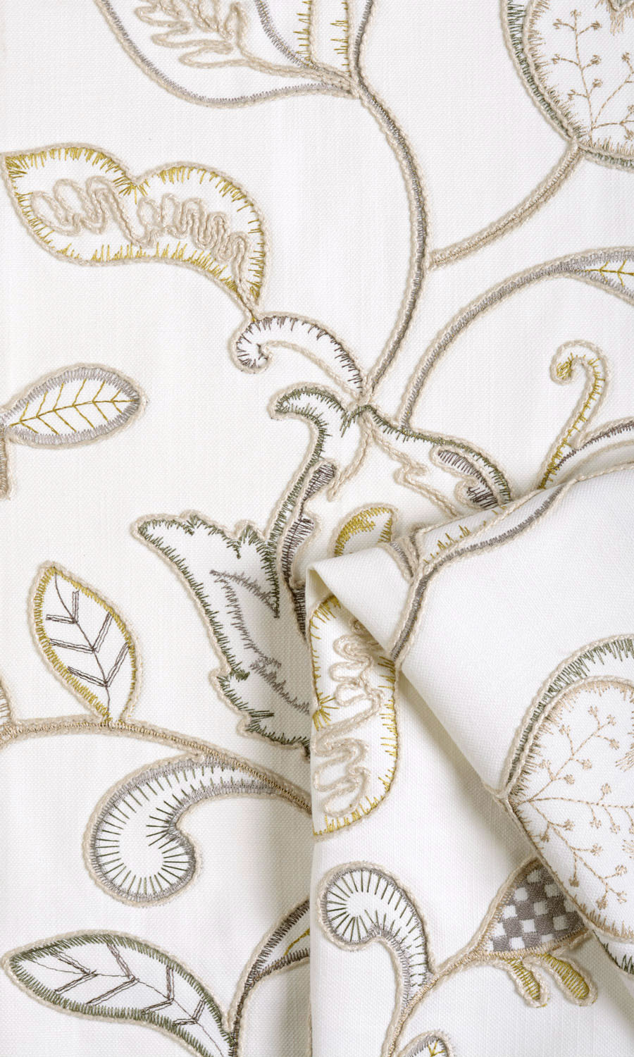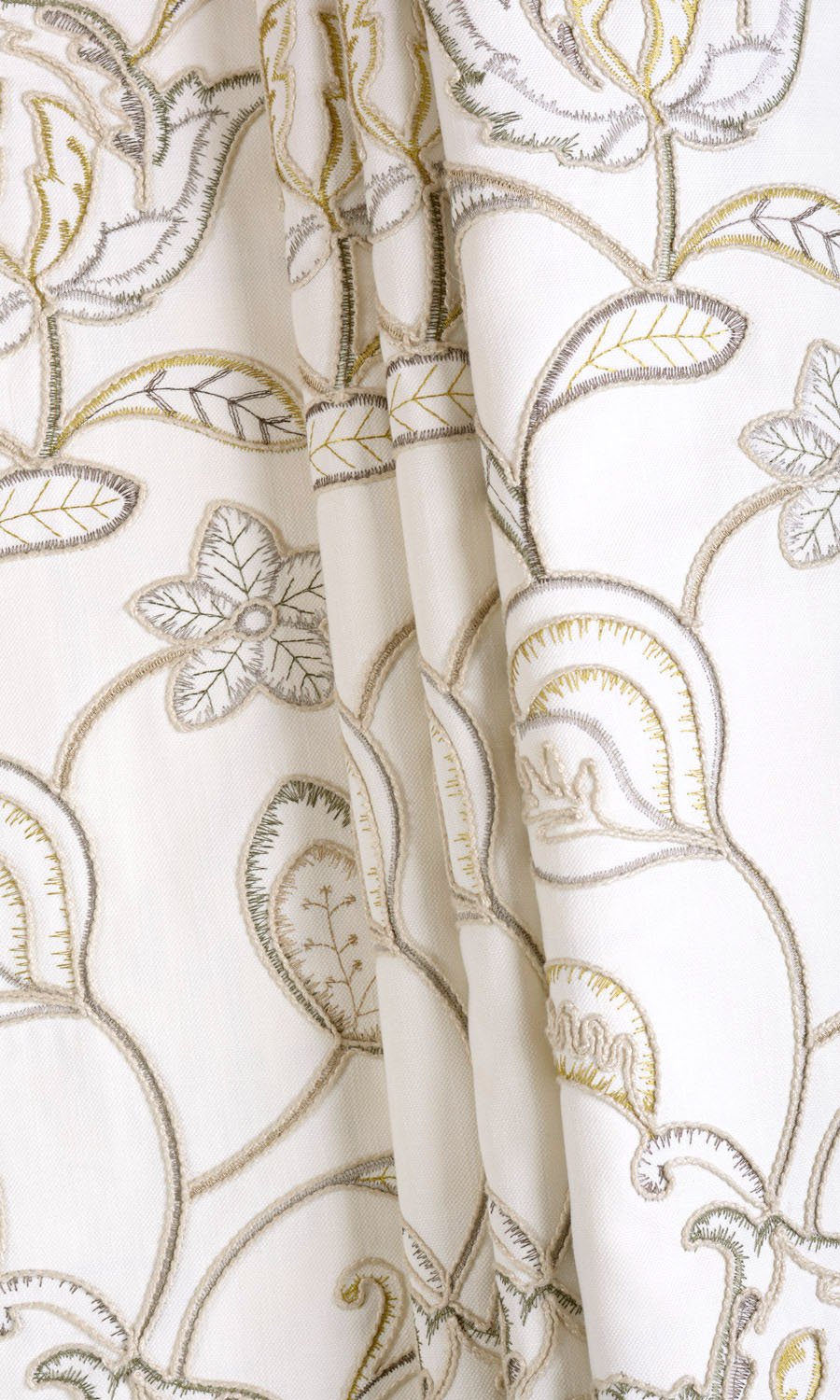 Can florals be sober? Can understated be luxurious? Look at Simply Shy and you will agree that this floral drapery fabric is sober, understated and yet, luxurious. The white base fabric is extensively embroidered in beige, gray and green with an intricate floral pattern full of curves and blossoms. The colors are soothing, the design is stunning.