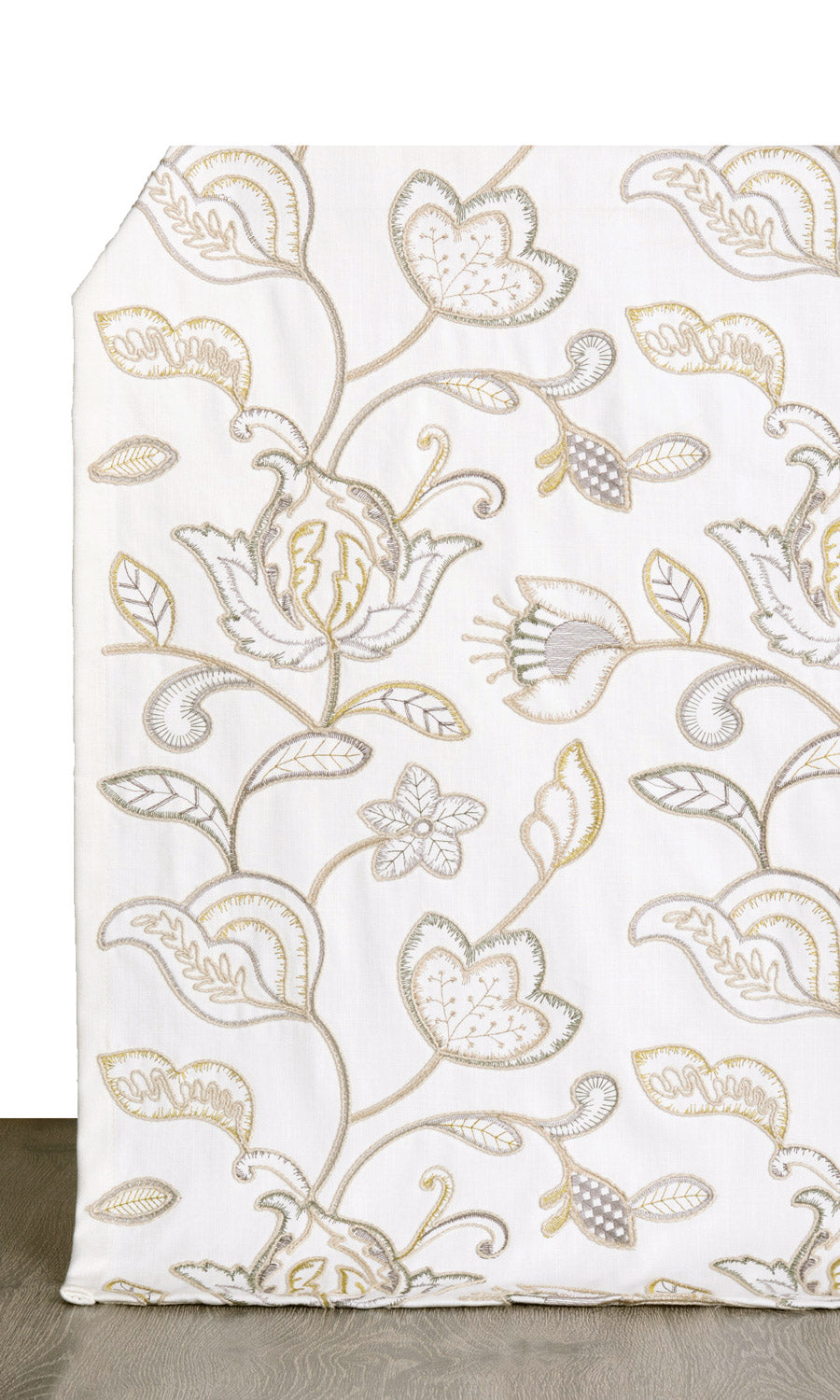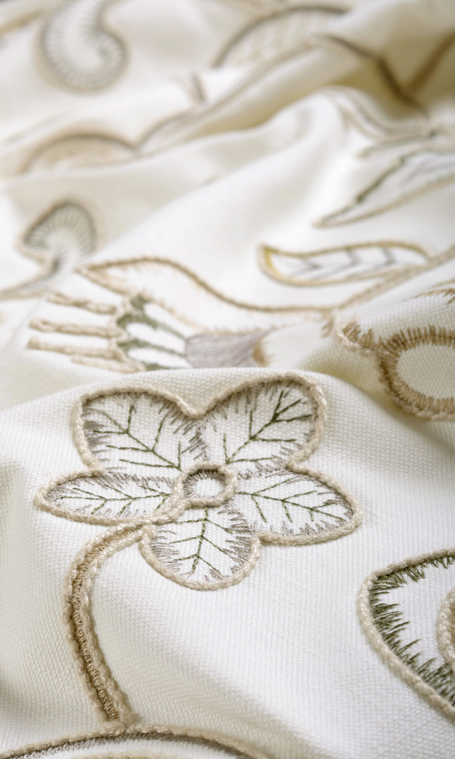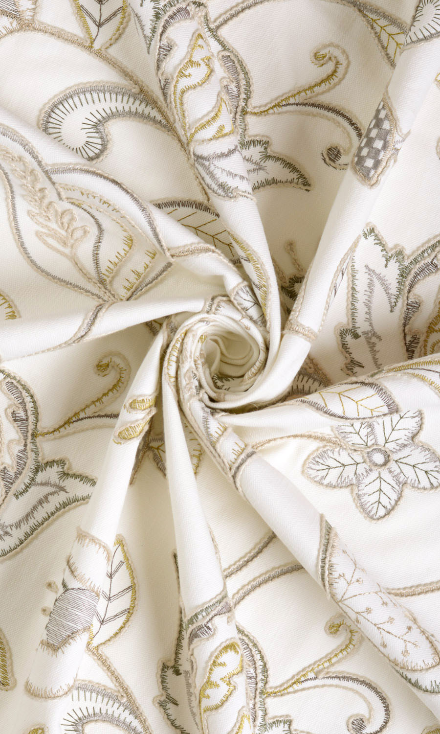 Can florals be sober? Can understated be luxurious? Look at Simply Shy and you will agree that this floral drapery fabric is sober, understated and yet, luxurious. The white base fabric is extensively embroidered in beige, gray and green with an intricate floral pattern full of curves and blossoms. The colors are soothing, the design is stunning.