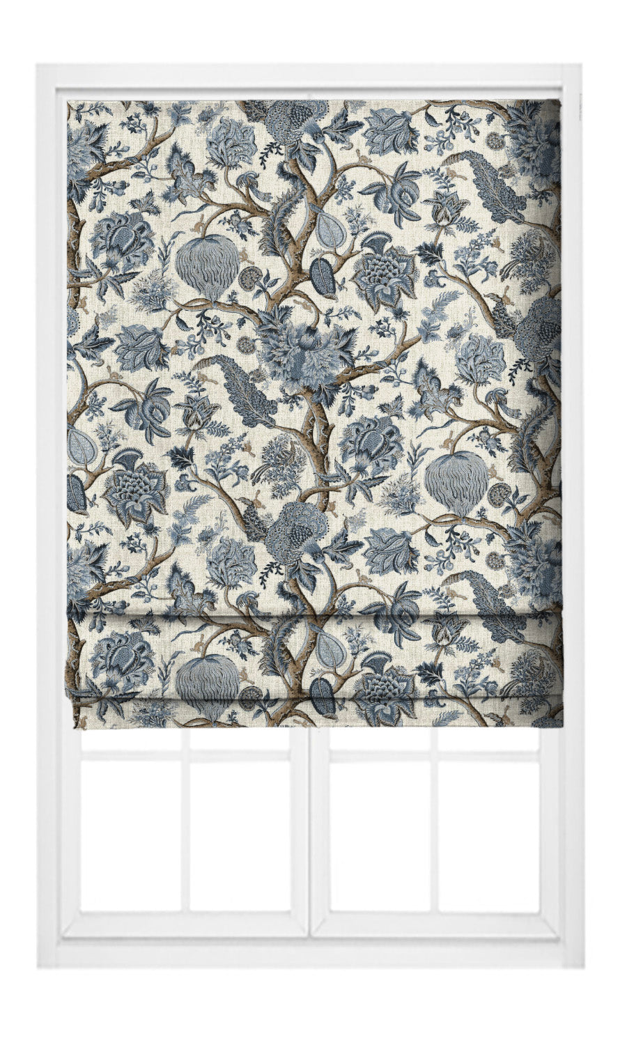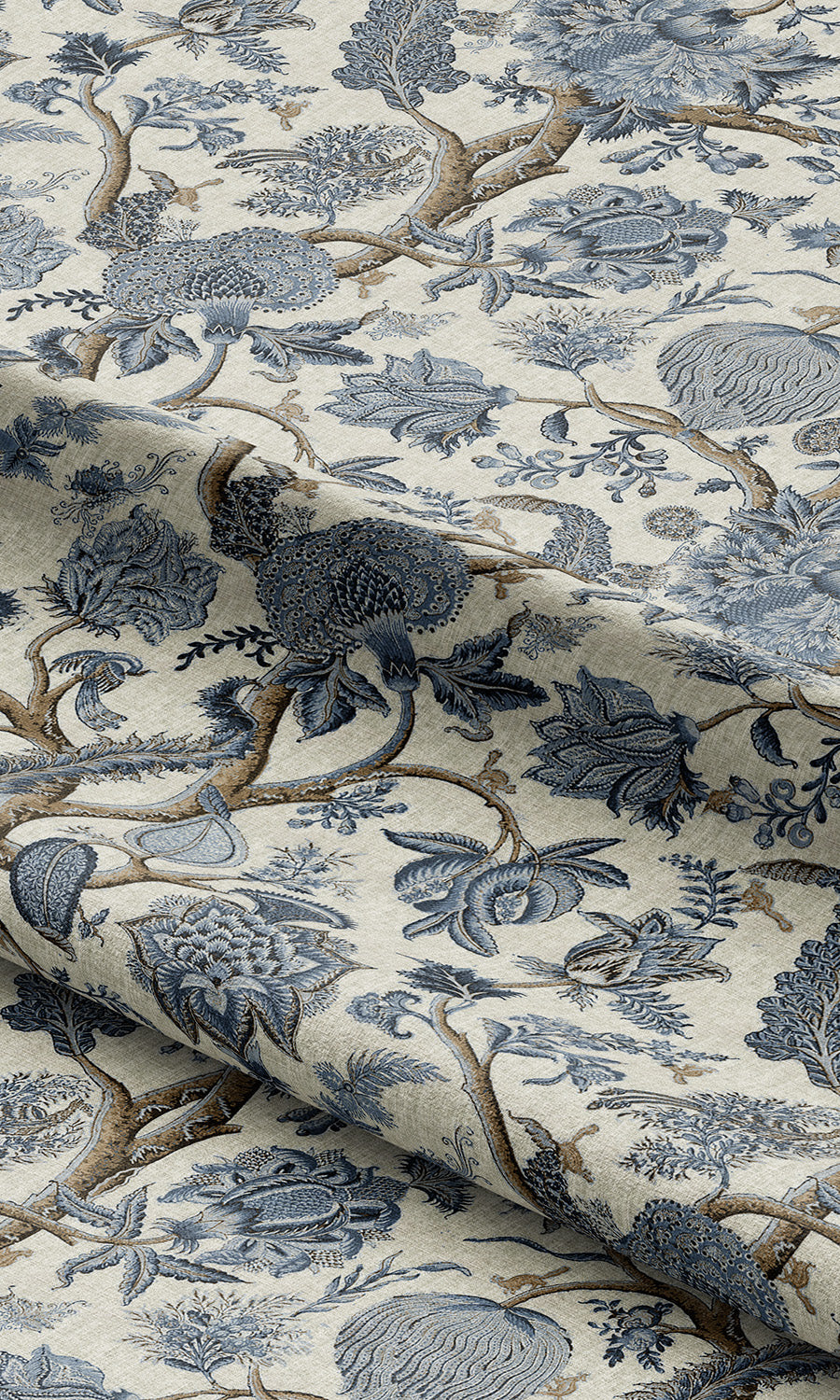 - Its indigo blue and brown accents blooming on a pale cream canvas, bringing depth to the design