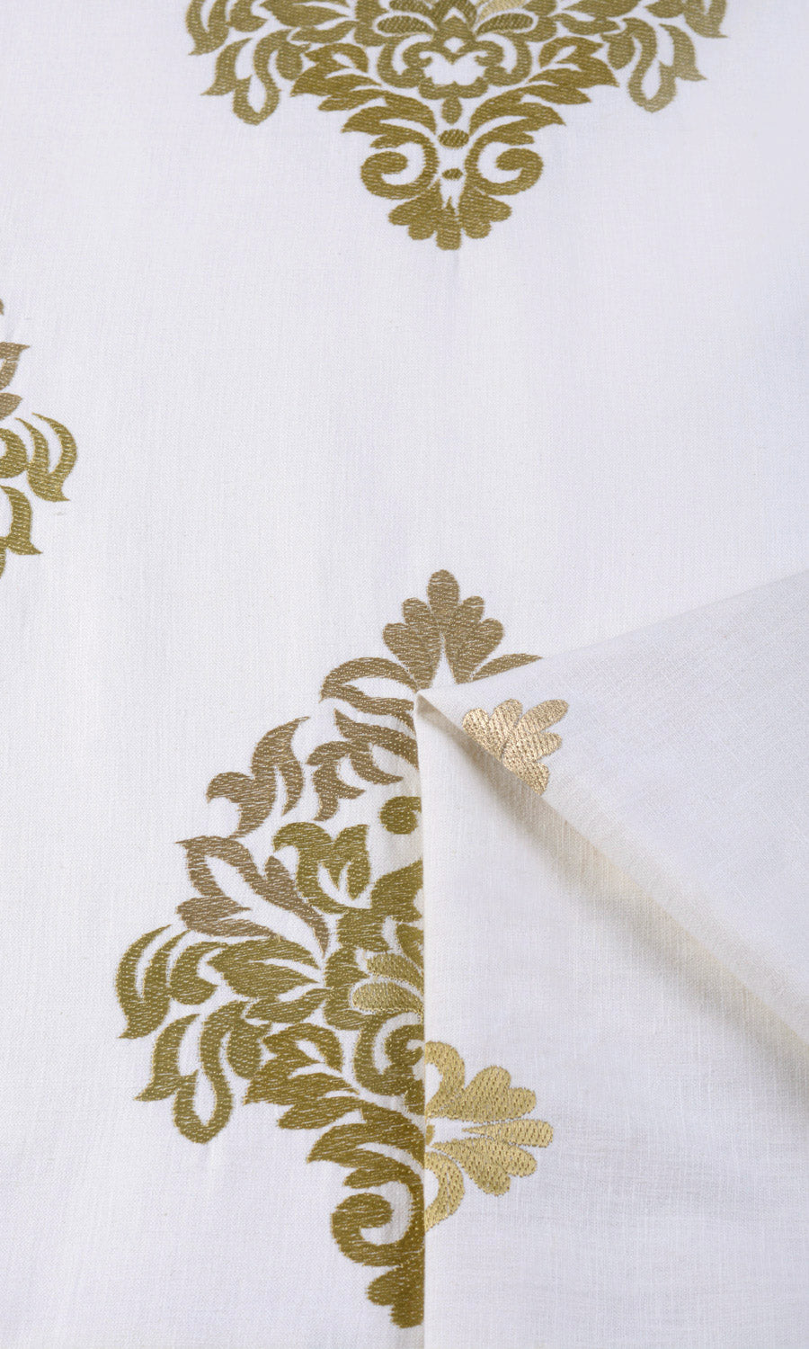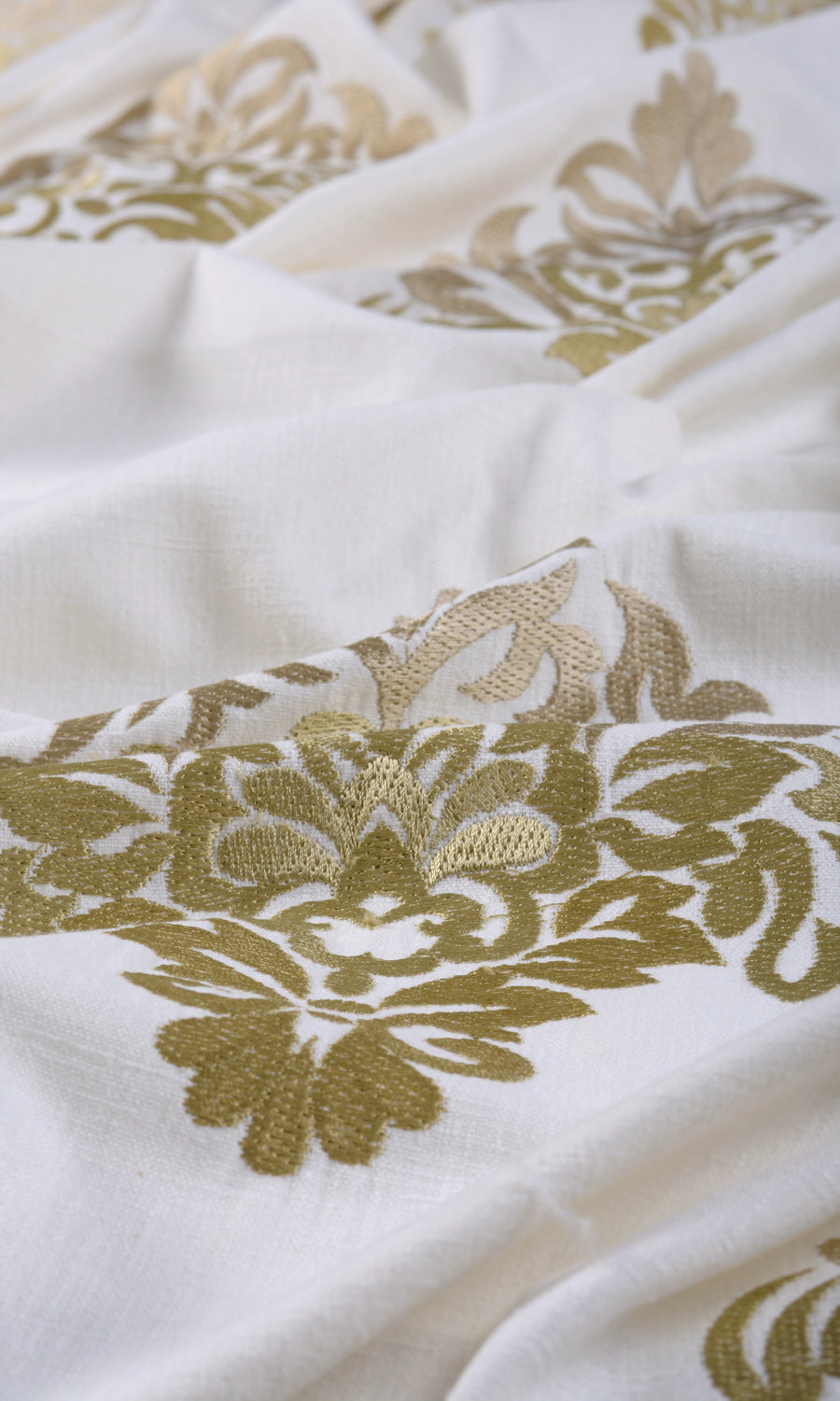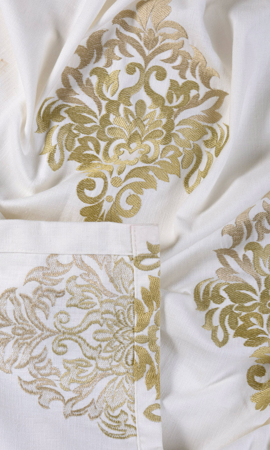 - Awe-inspiring damask beauty in embroidered gold accents