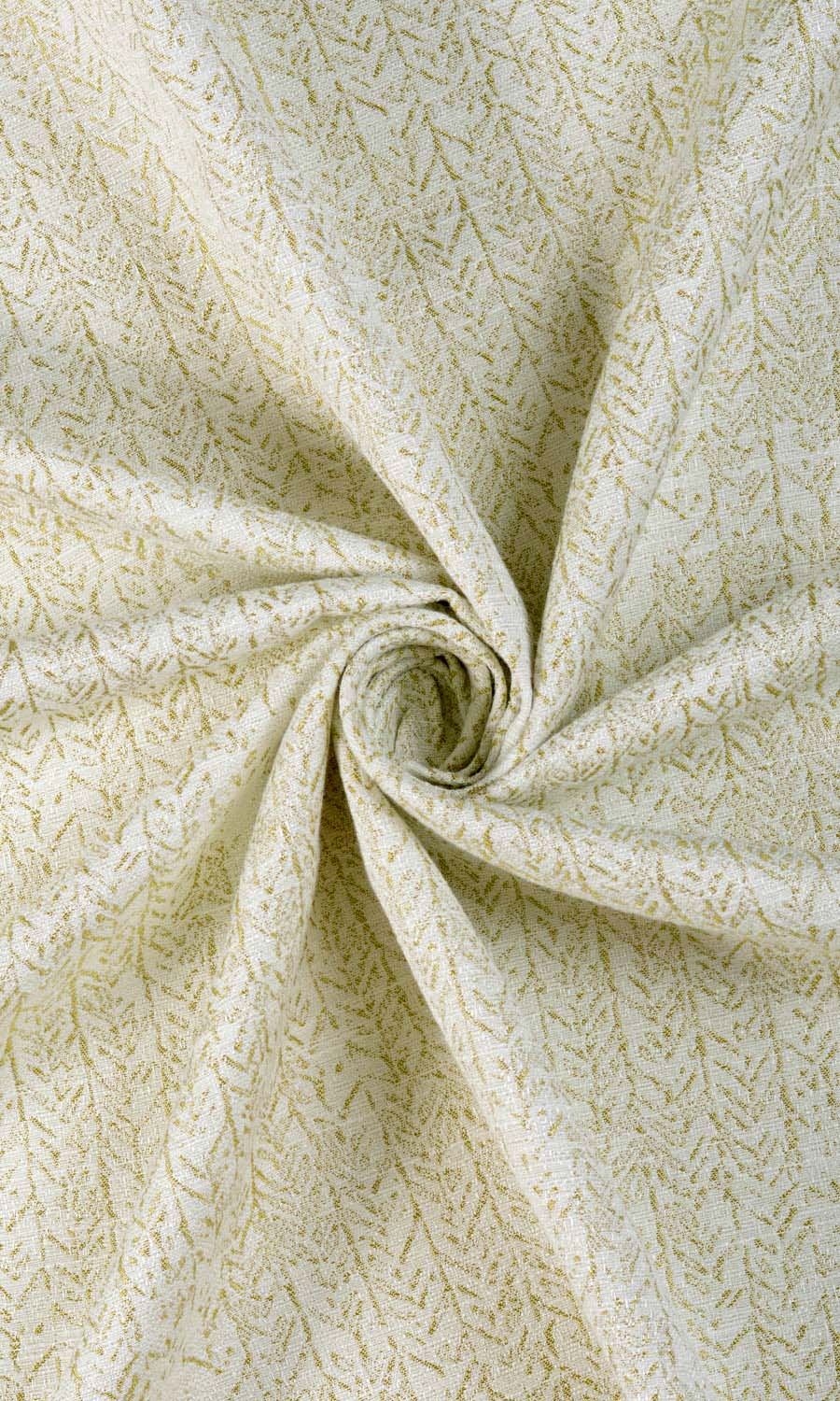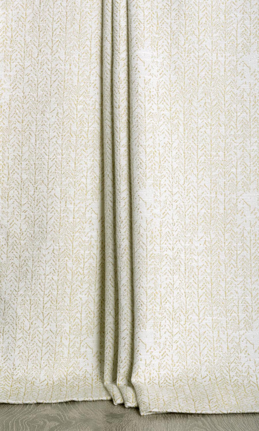 If you prefer minimalism with the barest hint of pattern in your drapery fabric pick, we recommend Snow Drop. This off white polycot fabric is patterned with the palest green for an understated look. The part-geometric, part-impressionist pattern has columns and chevron zigzags. The base fabric has a mildly rough woven look; the pattern also has a smudged feel that looks like a work of art.