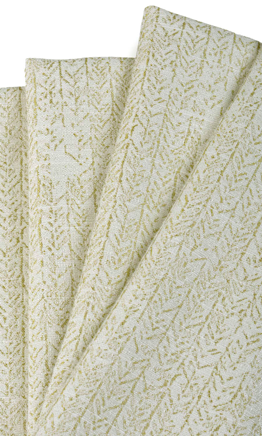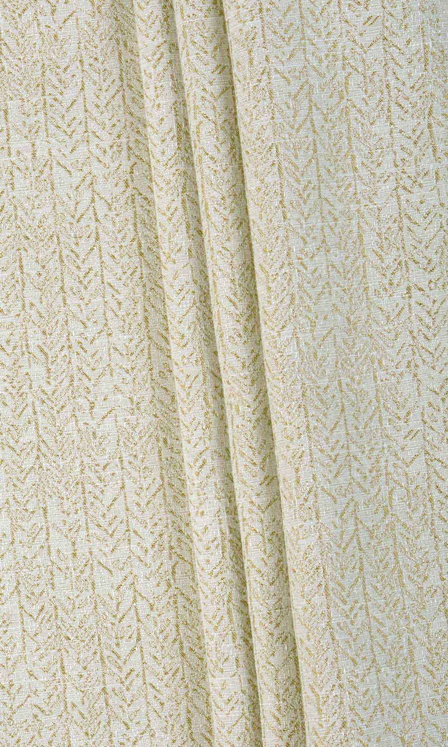 If you prefer minimalism with the barest hint of pattern in your drapery fabric pick, we recommend Snow Drop. This off white polycot fabric is patterned with the palest green for an understated look. The part-geometric, part-impressionist pattern has columns and chevron zigzags. The base fabric has a mildly rough woven look; the pattern also has a smudged feel that looks like a work of art.