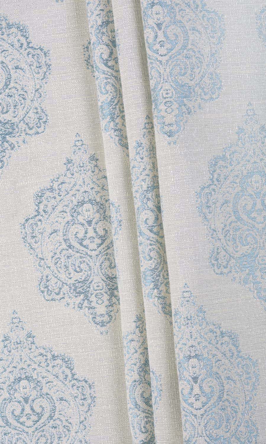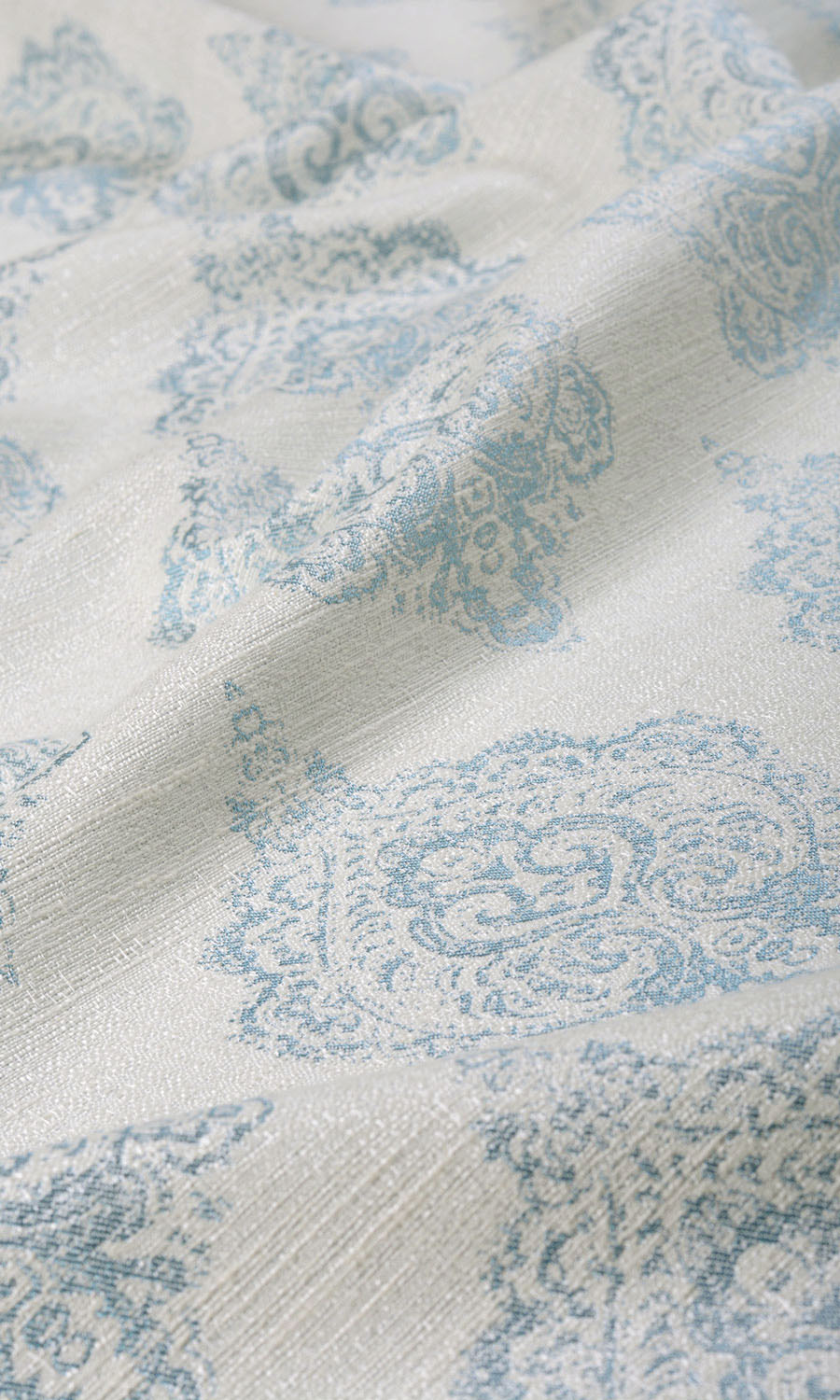 If you like traditional jacquard motifs but dislike intense color palettes and overly ornate design elements, Southern Skies should appeal to you. This sturdy polycot drapery fabric has an off-white base patterned with a traditional, oversized and stylized botanical motif in a delightful blue. The texturally rich base and the raised pattern look good together; as does the simple no-fuss color combination.