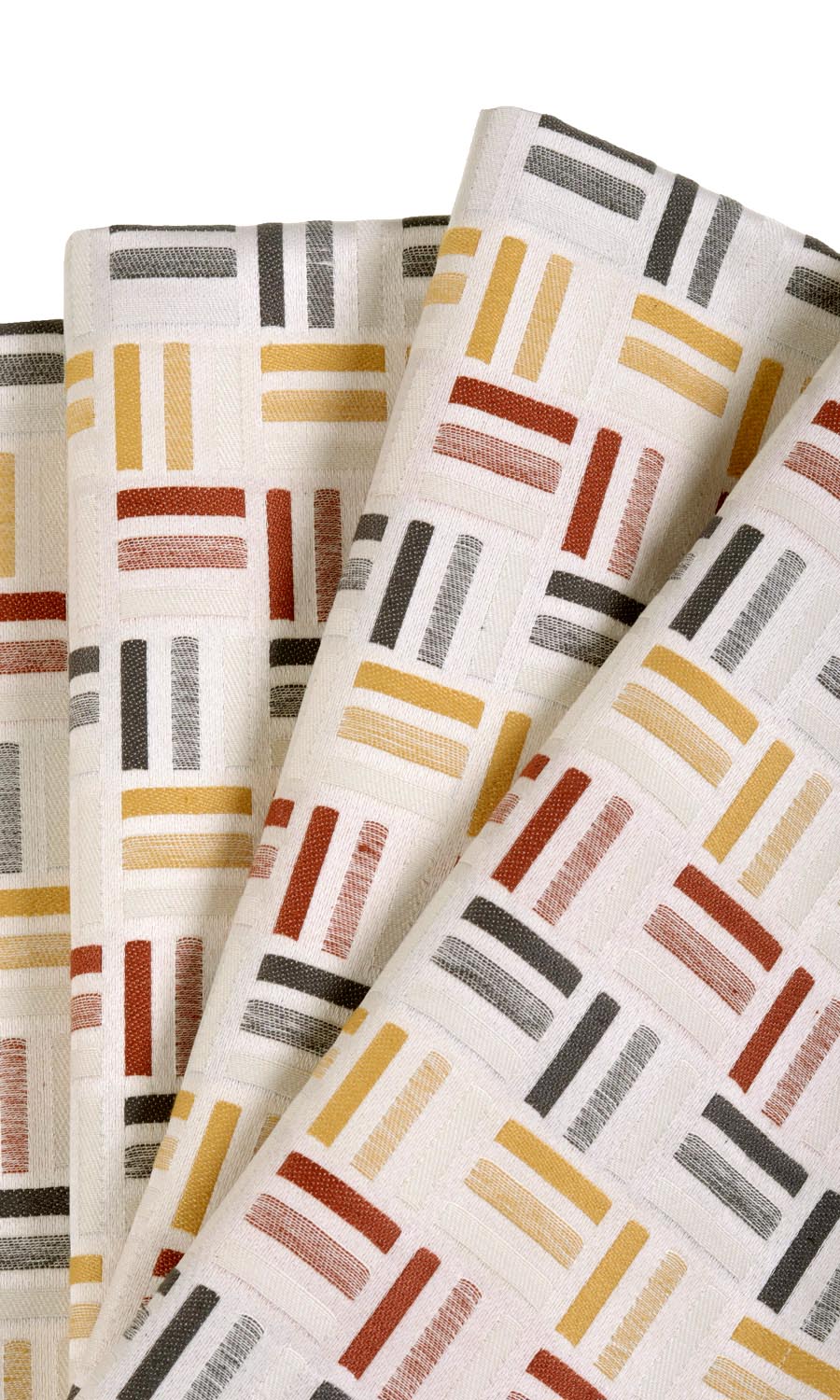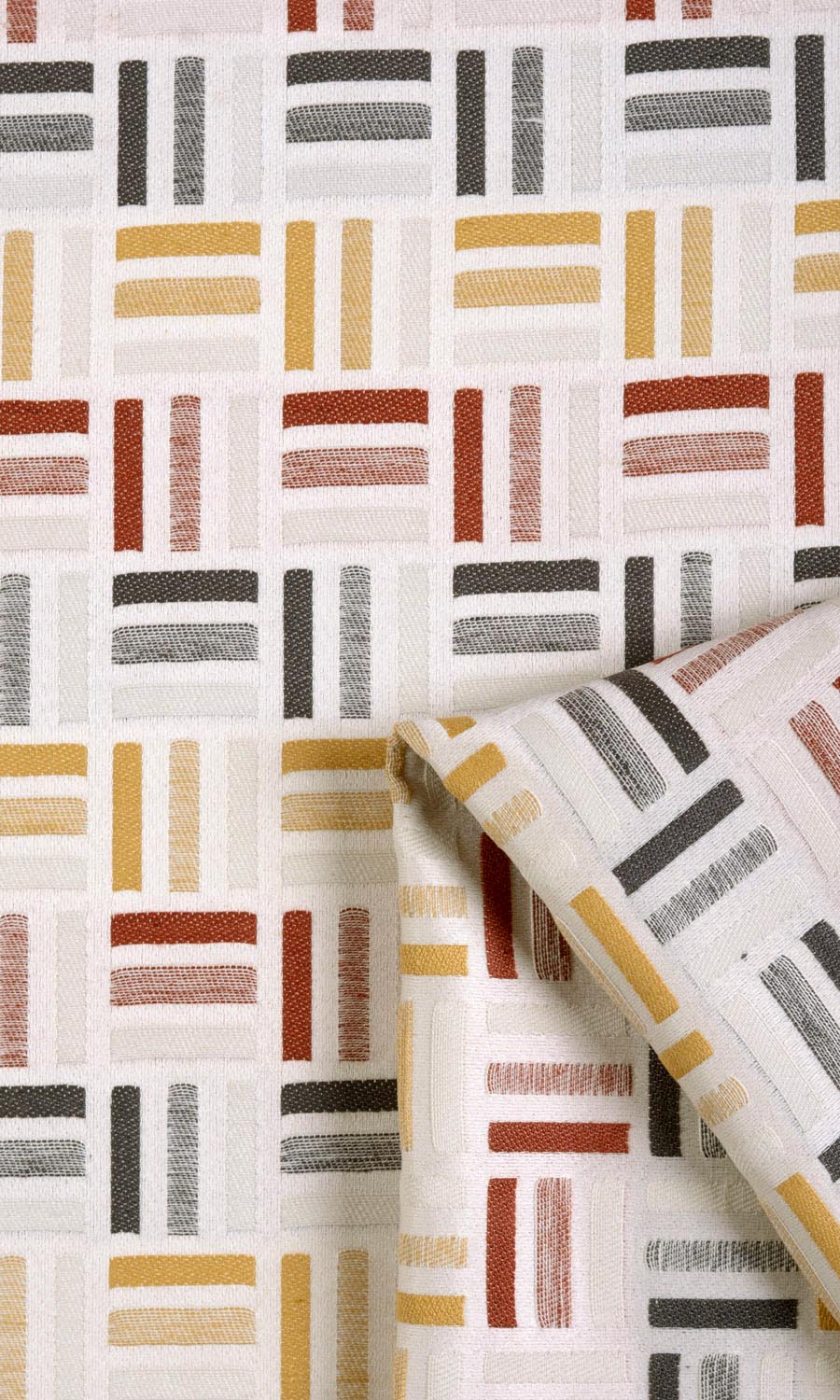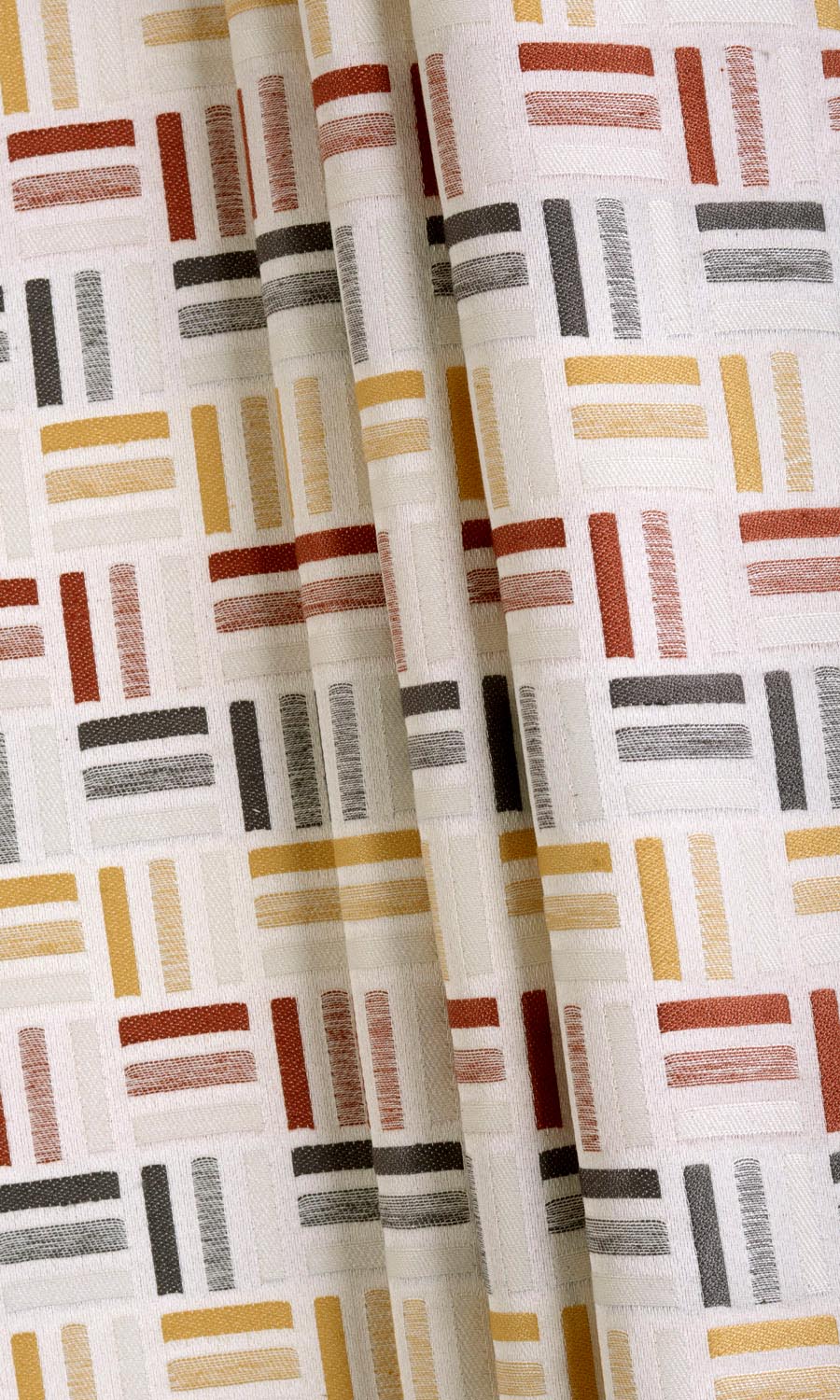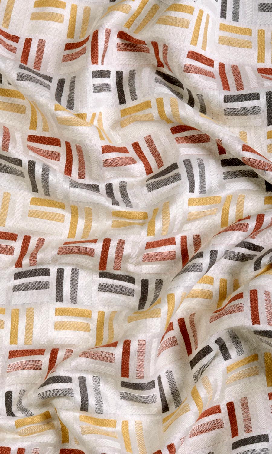 Ladder meets checks style weave with shaded effect. The color palette of crimson red, ocher yellow and charcoal black on pure white backdrop is bold and bright. On the whole, this drapery fabric is just happiness, happiness, happiness.