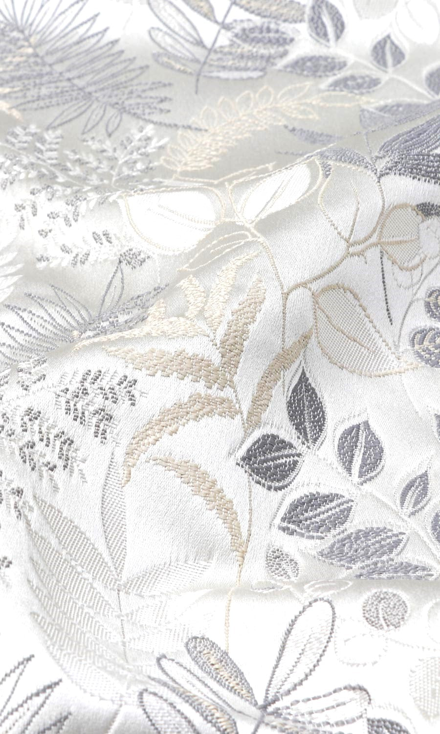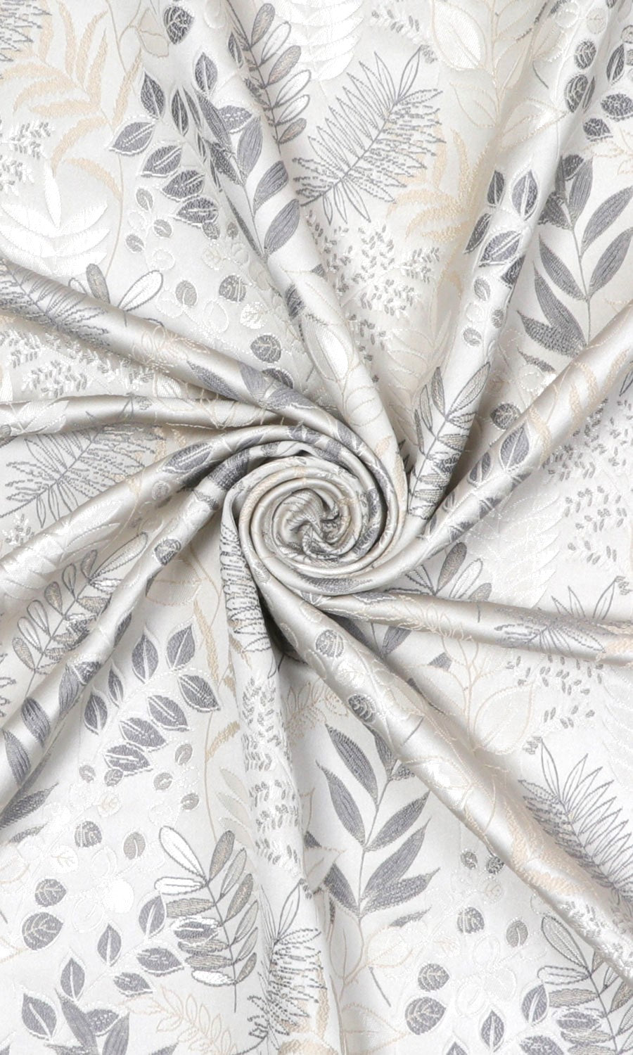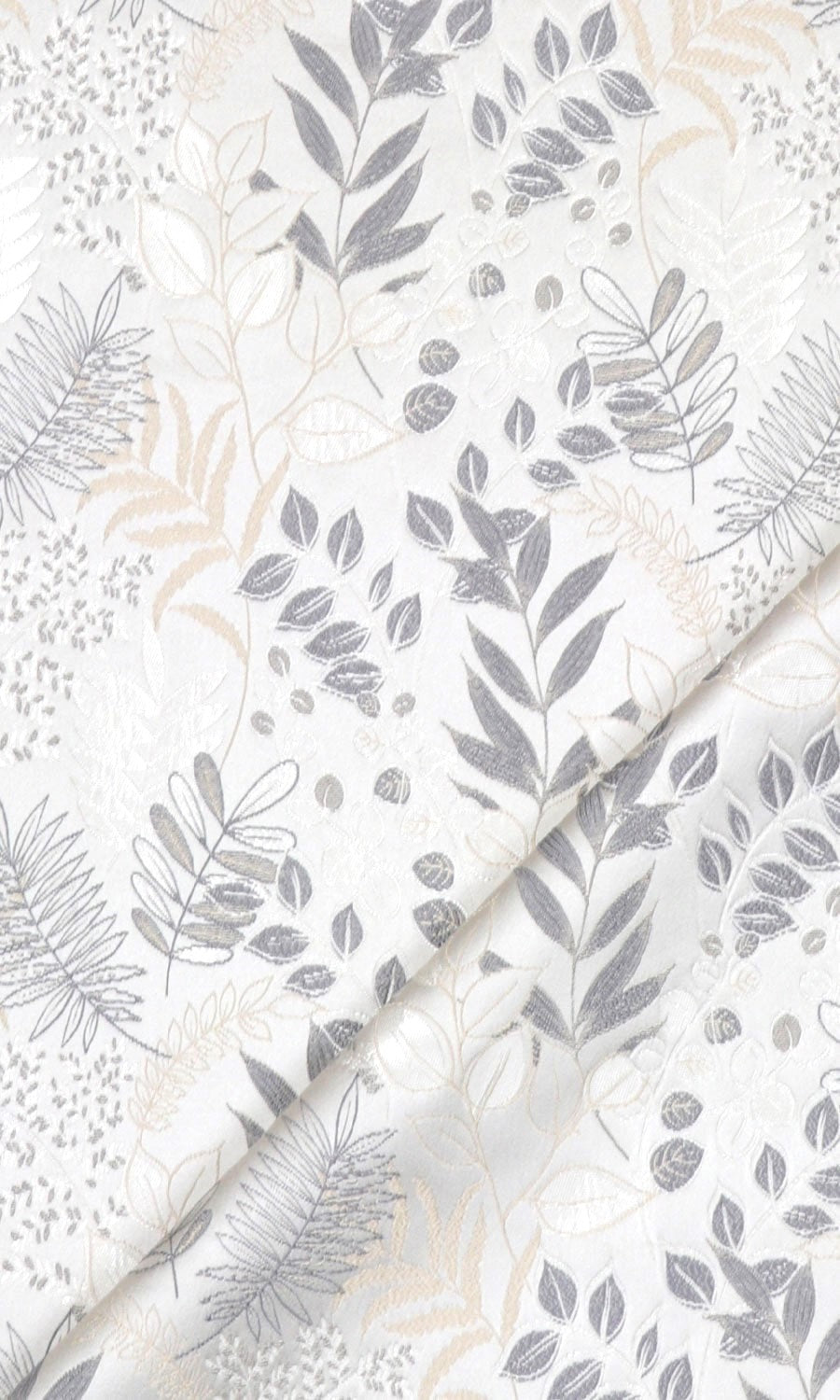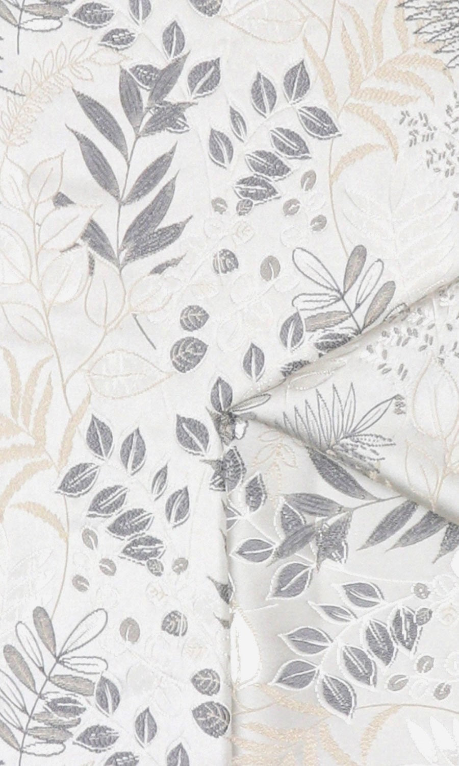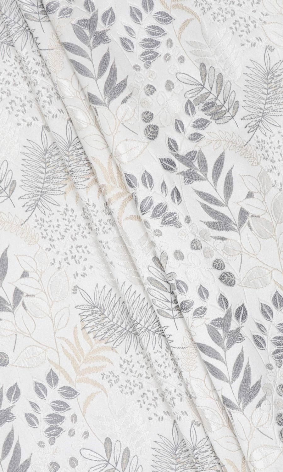 Botanical prints in quiet colors and a gentle sheen. Bring nature-inspired themes to your decor with Stepping Stone' intricately detailed leaf prints in grey-white palette. Its vertical layout draws the eye upward, making it a great choice for low-ceiling rooms to create the optical illusion of a taller window and higher ceiling.