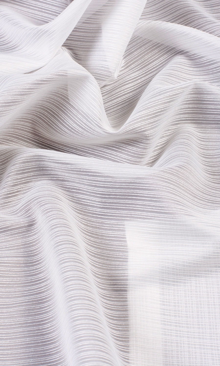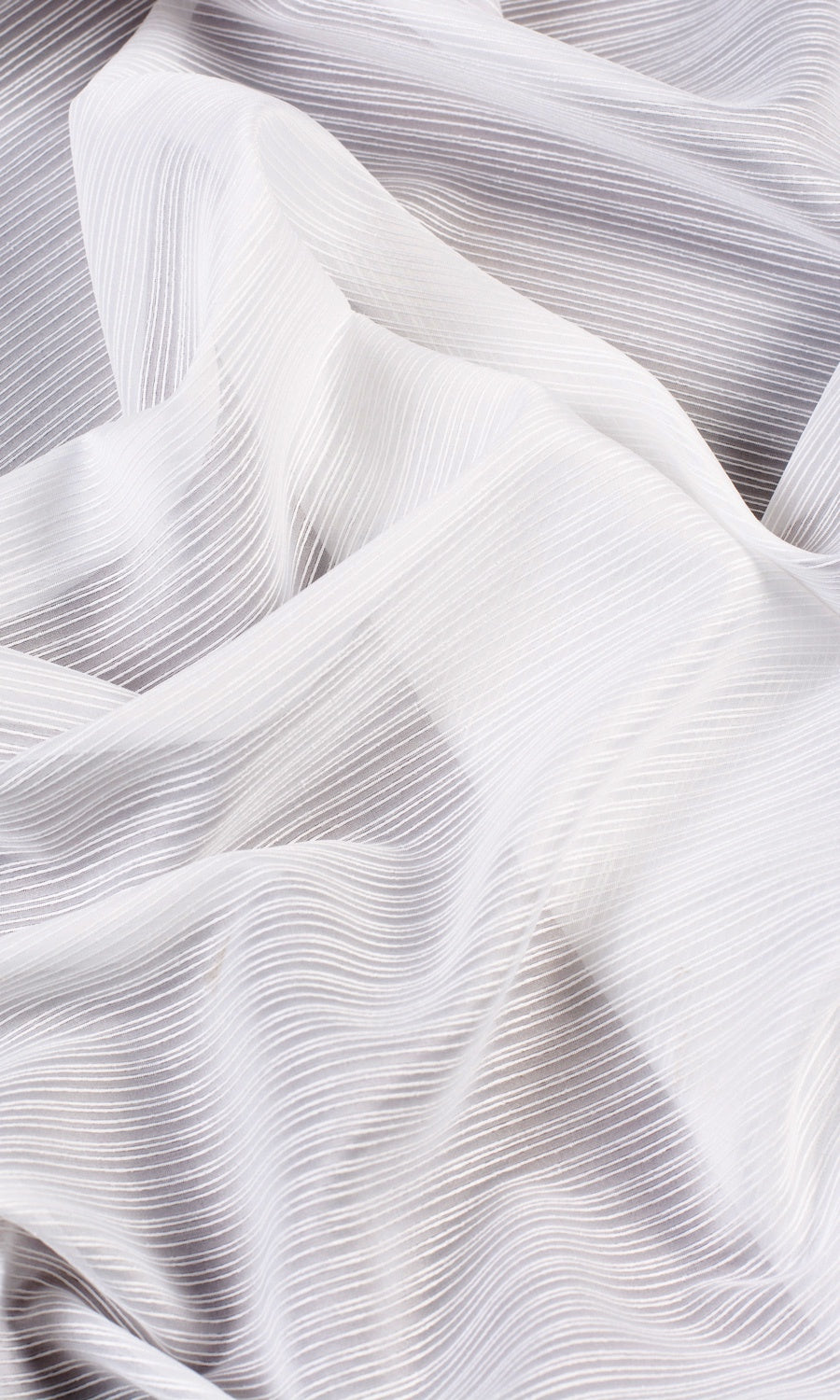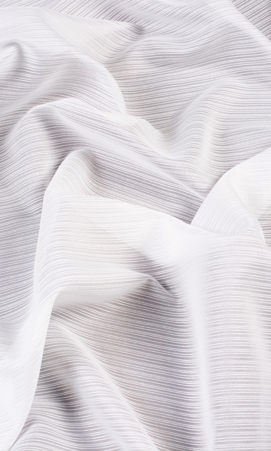 An ethereal white sheer! Mimicking the ridges of a whelk shell, Stonewashed offers lustrous ridges on a pristine white sheer base. With just a hint of glamor and detail, this sheer offers to walk with the minimalist savoir-faire of modern spaces and light-filled homes.
