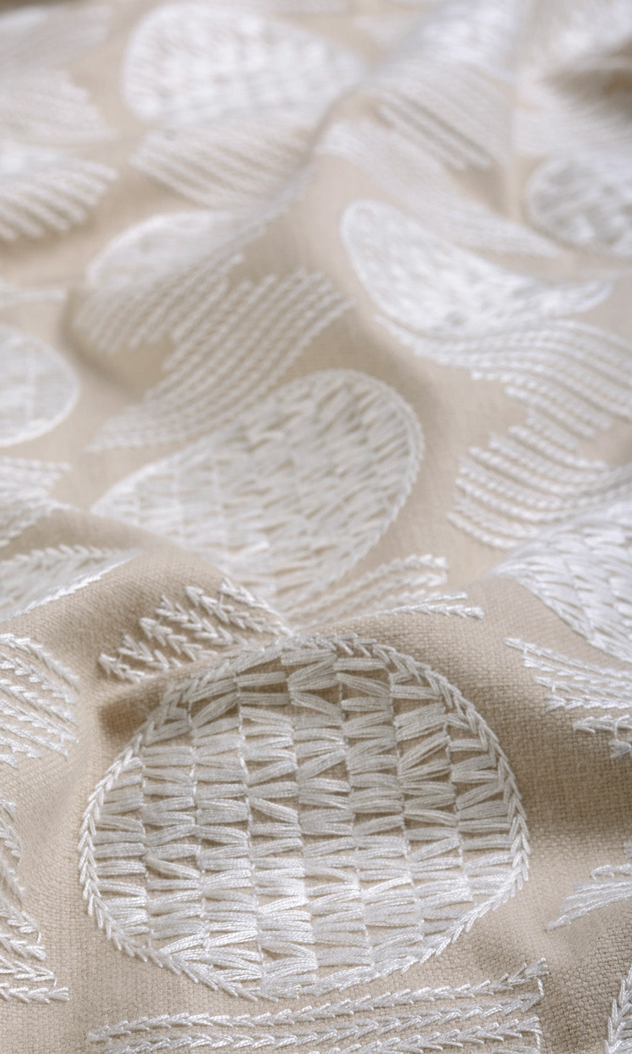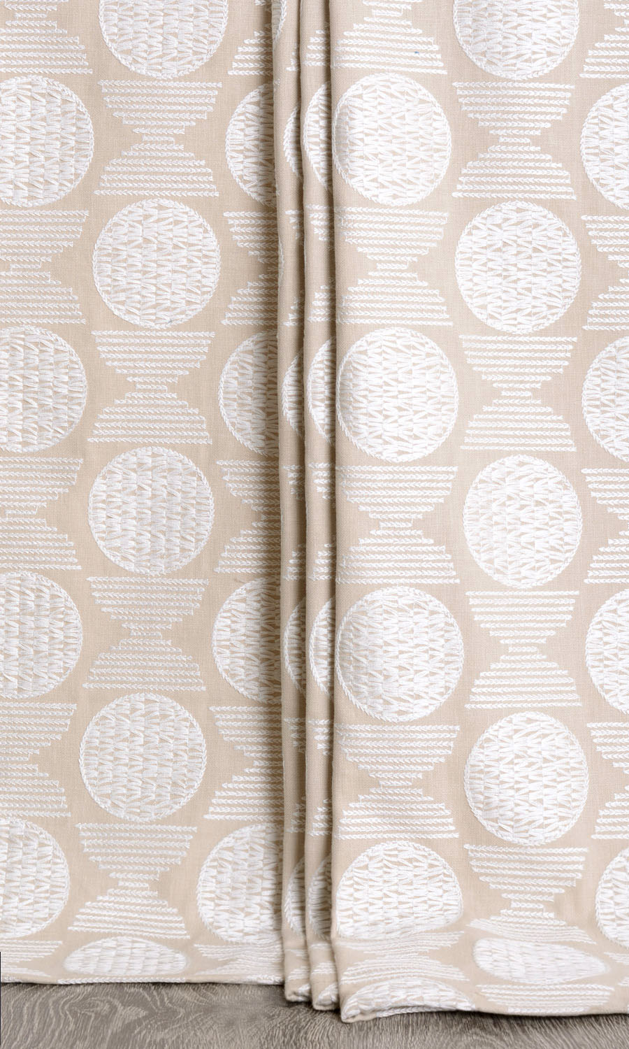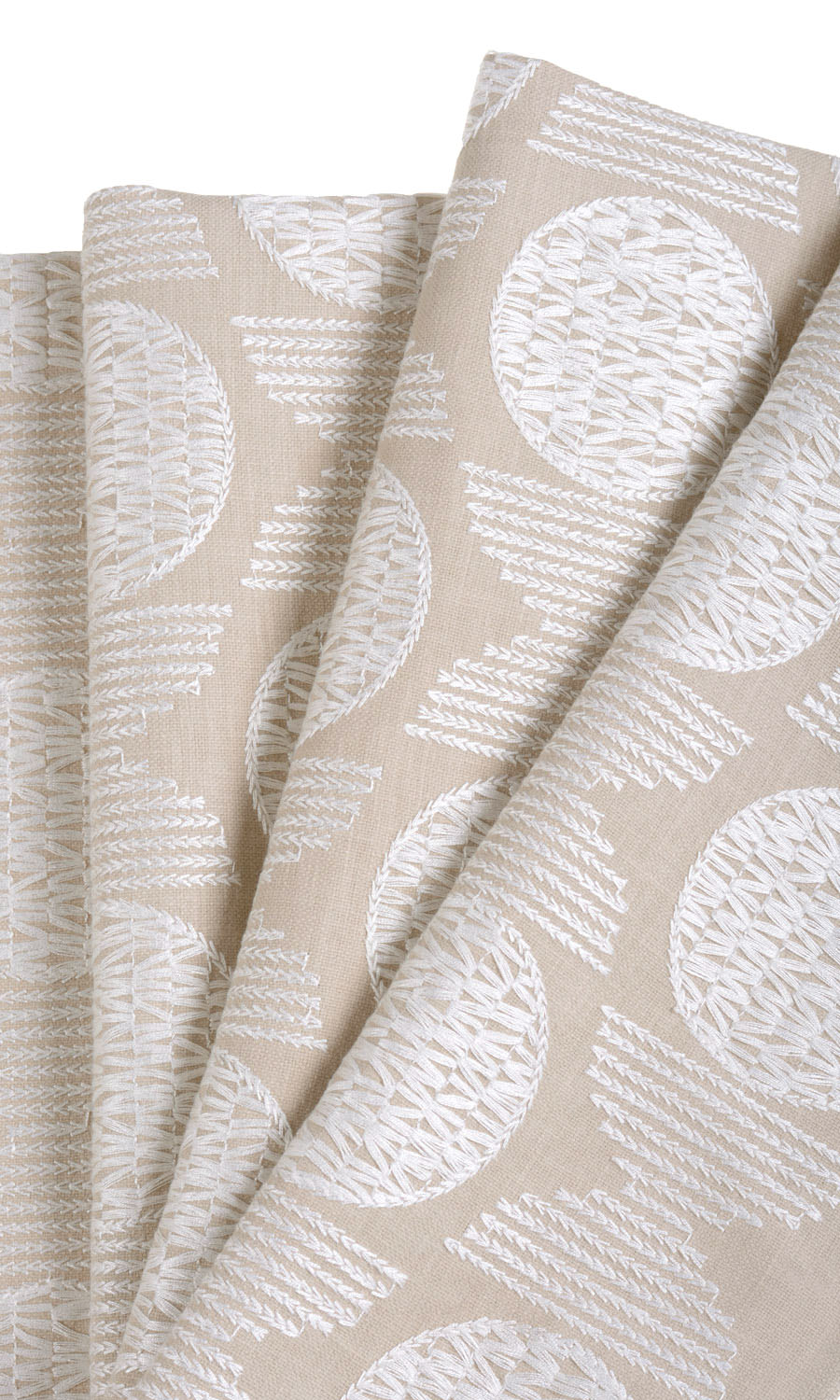 Geometry transforms into refined harmony. This beautiful beige fabric has been embroidered in white thread with circles and half circles motifs placed alternately. The look is understated yet elegant. A good choice for those who like the neutral look with a touch of decorativeness in their decor.
