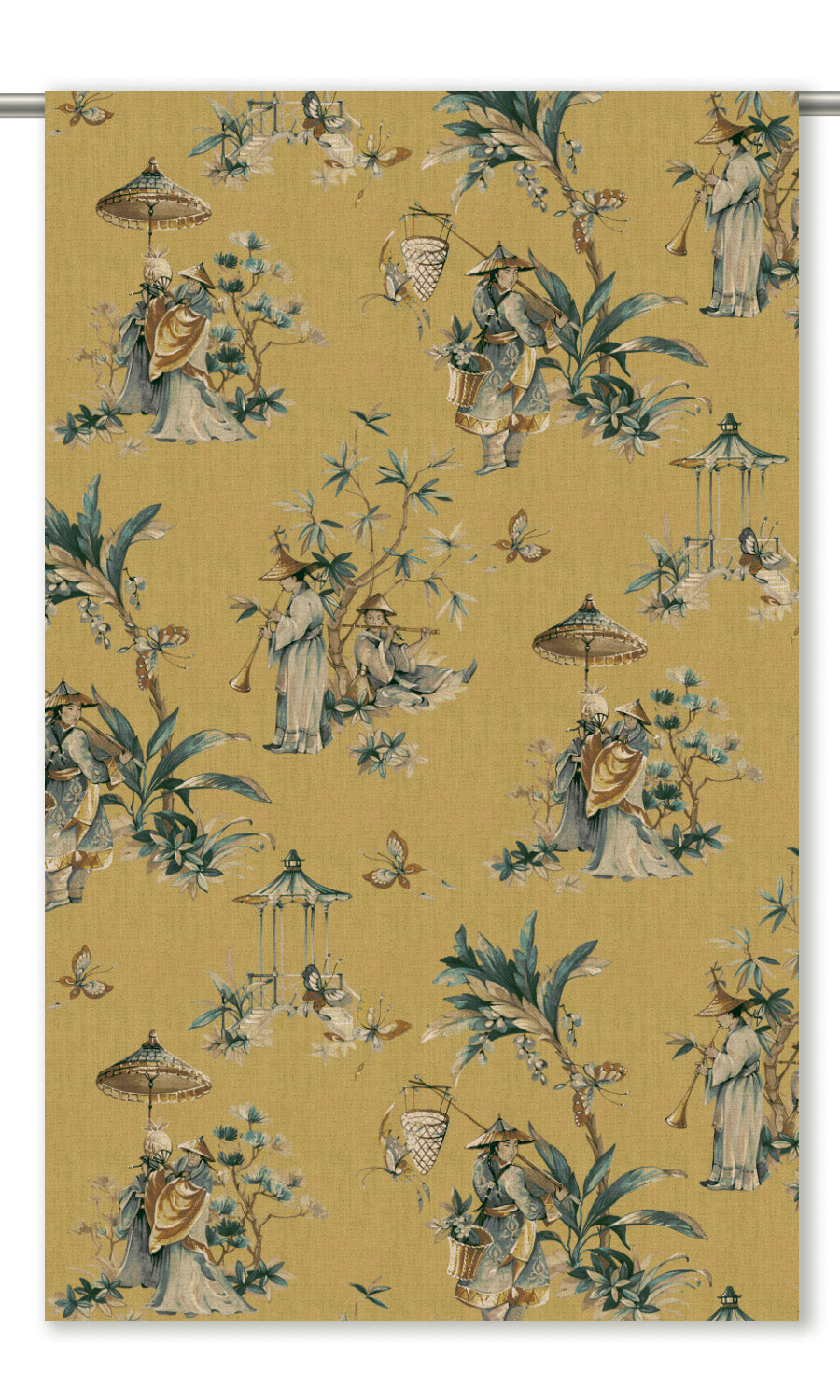 Its charming chinoiserie print depicting delicate vignettes of life and labor, where musicians and harvesters in traditional attire animate a serene Asian landscape