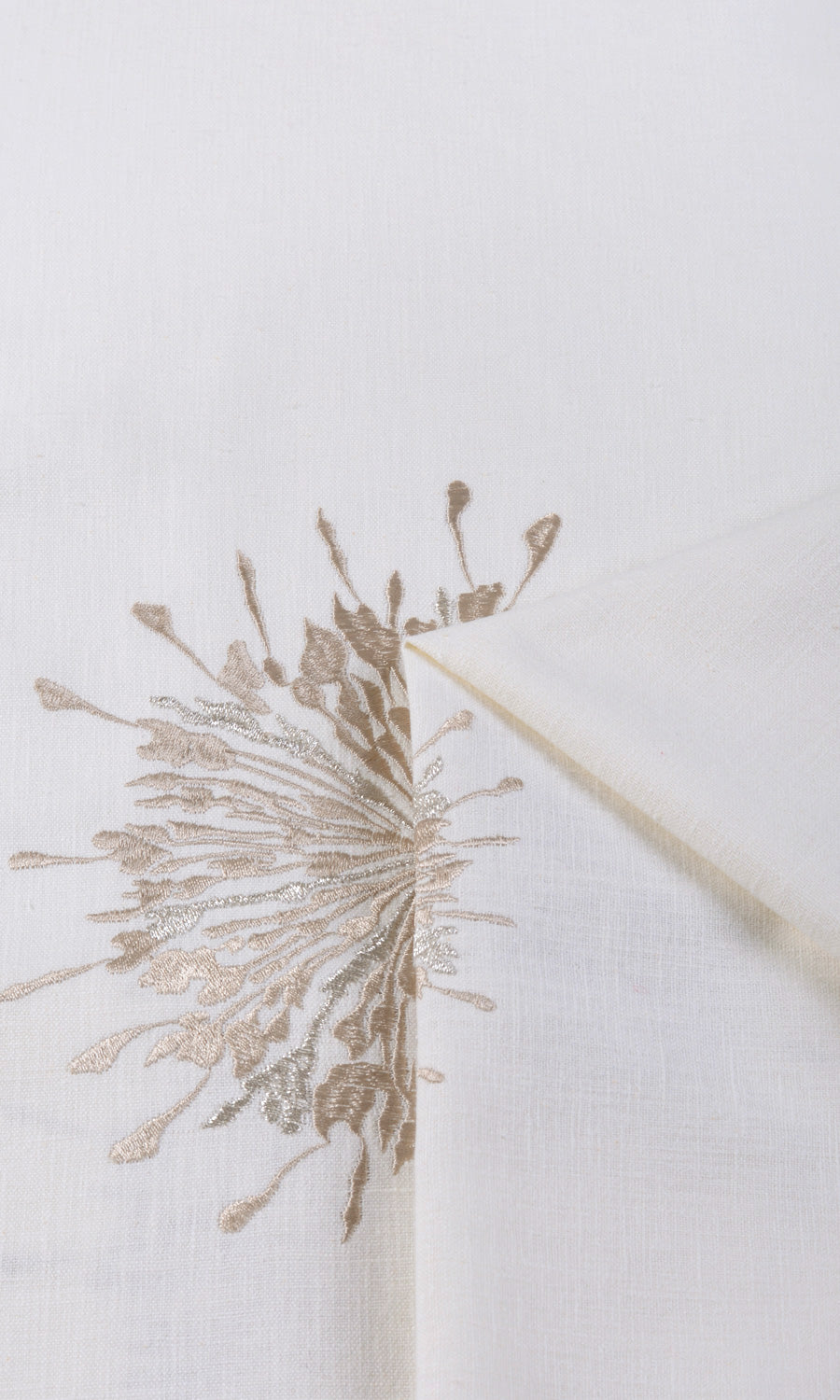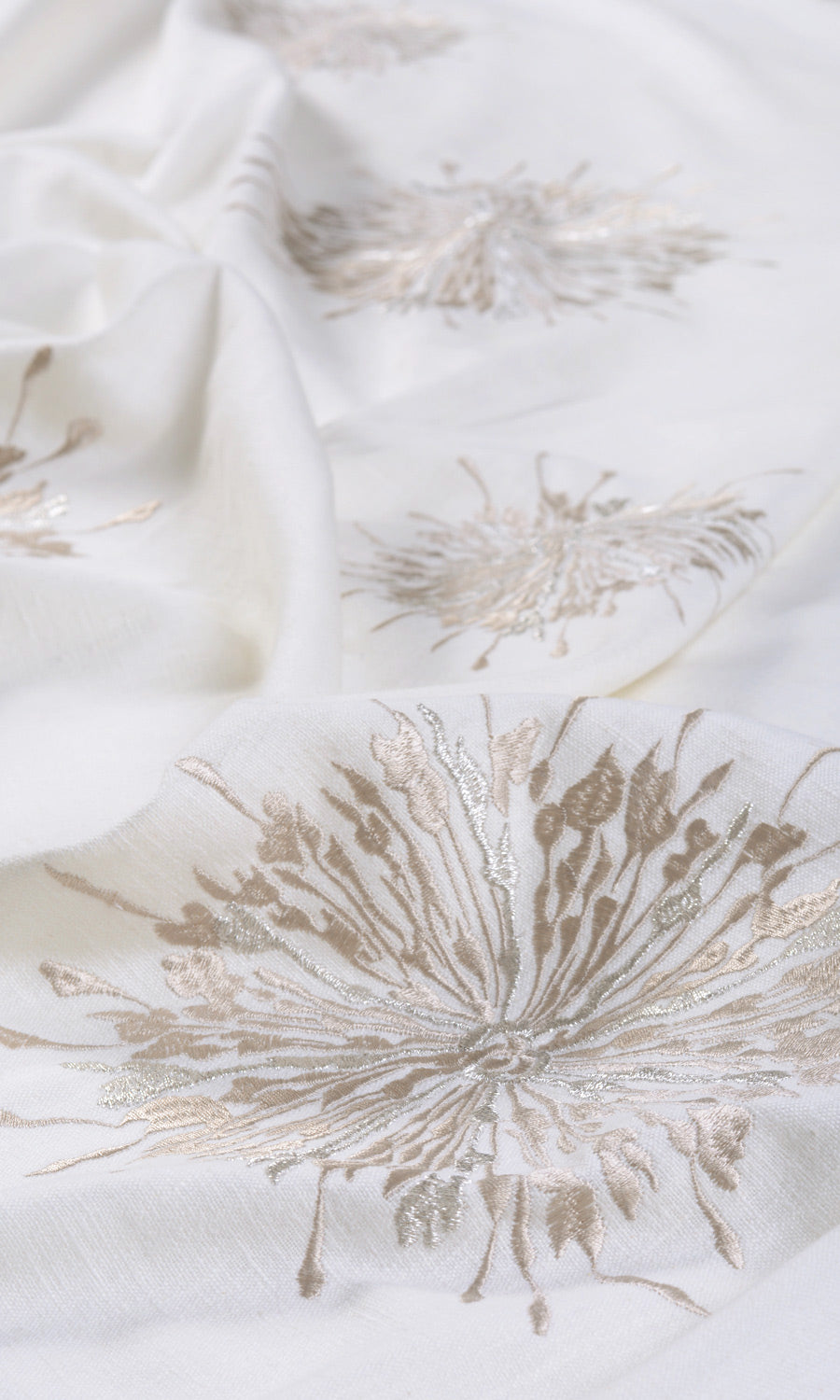 When the God of Interiors says, let there be light, Suncoast emerges. Its off white base is embroidered lavishly with pale beige sunburst motifs all over. The rays spreading out from the sunbursts look spectacular. A durable blend of cotton, polyester and viscose, the fabric drapes well, stays in mint condition for long.