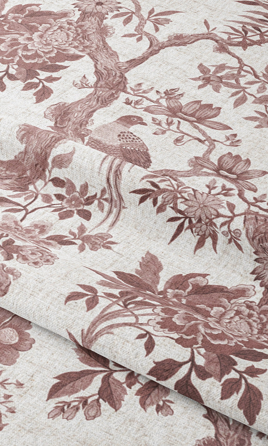 • Its arboreal branches, teeming with lush flowers and songbirds, evoking a classic toile's quiet refinement and chinoiserie's painterly charm