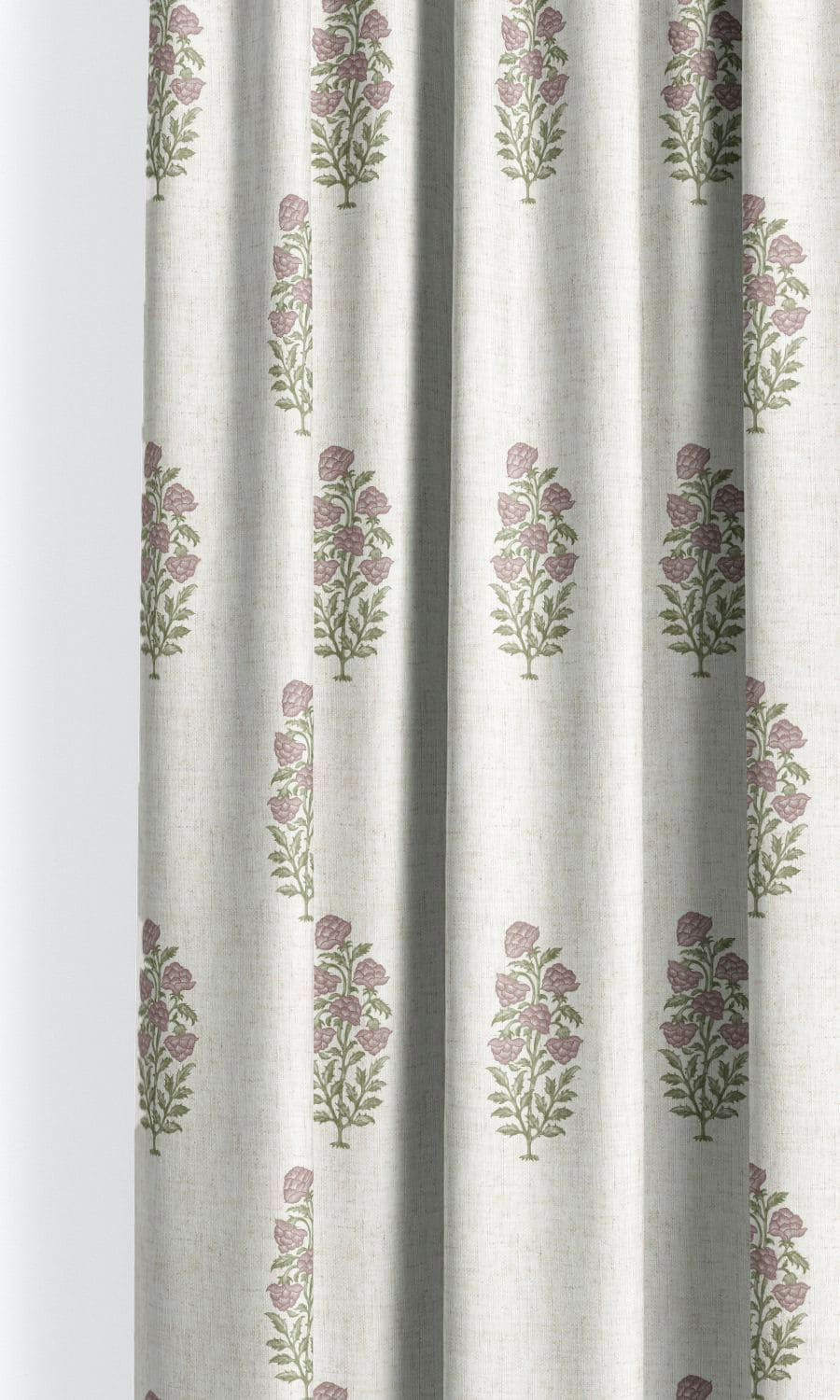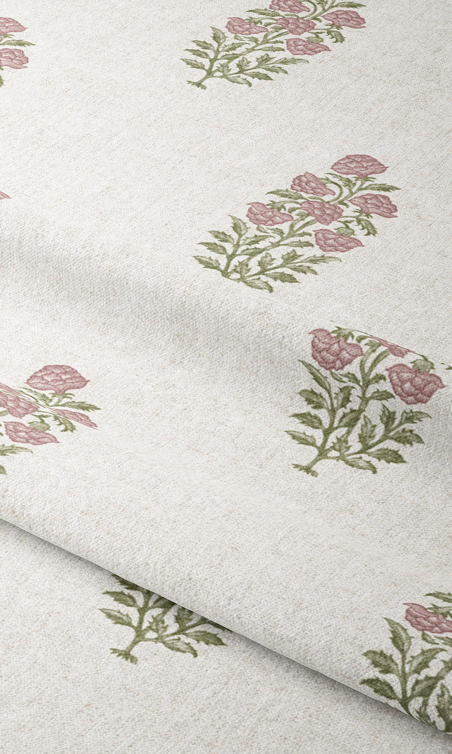 - A parchment white canvas where dusty pink and green stage a floral tableau with delicate elegance