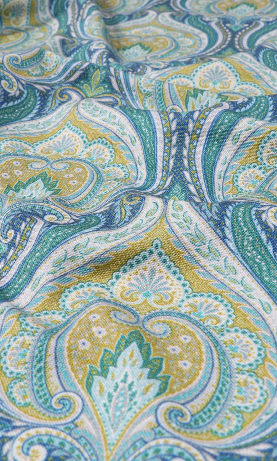 A pure cotton with traditional Indian floral prints. Intricacy and delicacy combine in this end-to-end printed fabric of curlicued leaf-like motifs. If your room looks too plain for lack of patterns or needs a focal point to garner attention, trust Tanjore swarming florals to do it without over-engaging in colors. Pair with a solid blue for an even bigger visual impact.