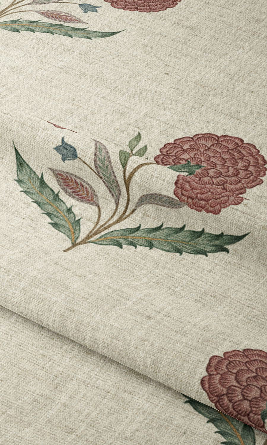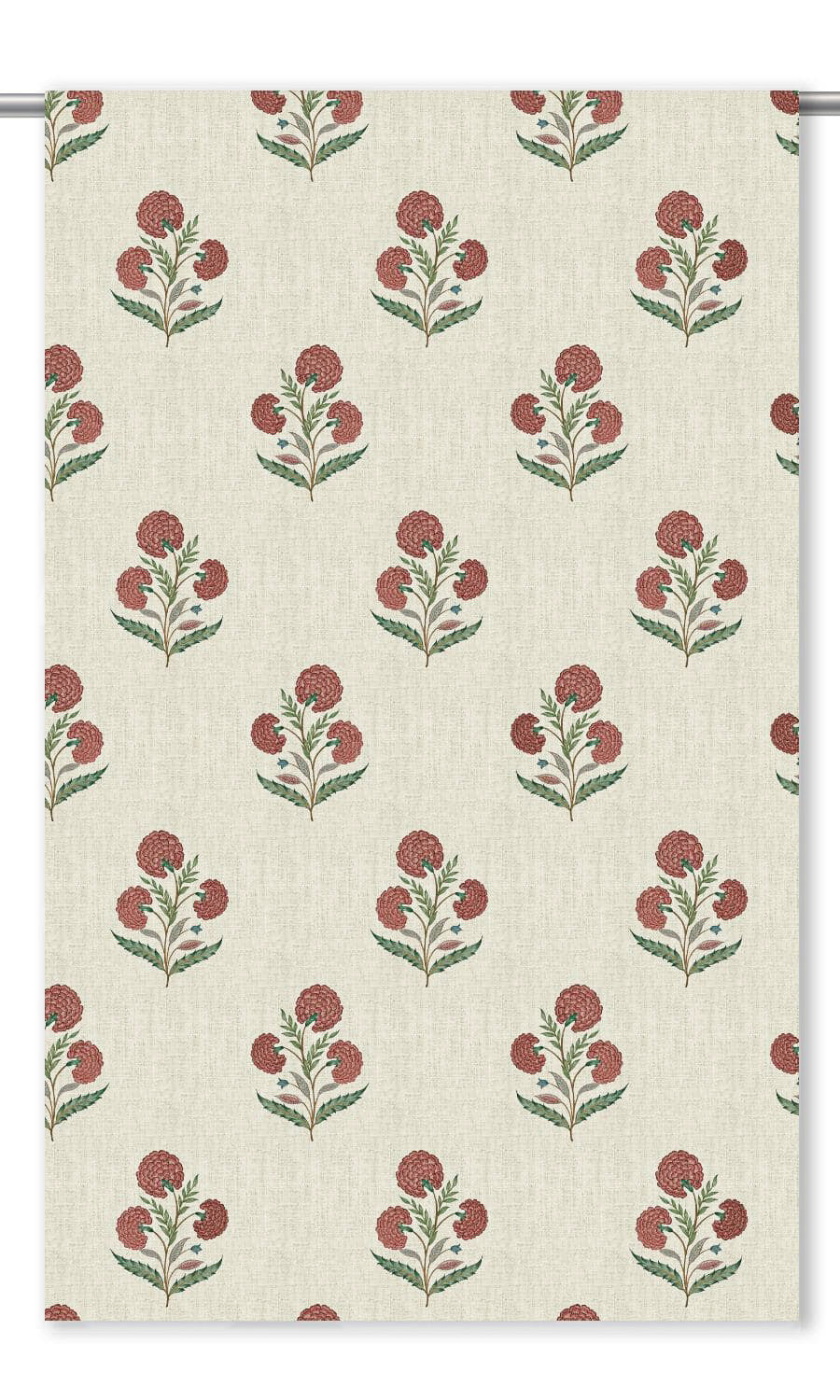 - Deep red and olive green unfurl on linen-textured beige, bringing cozy cottage warmth to every sunlit window