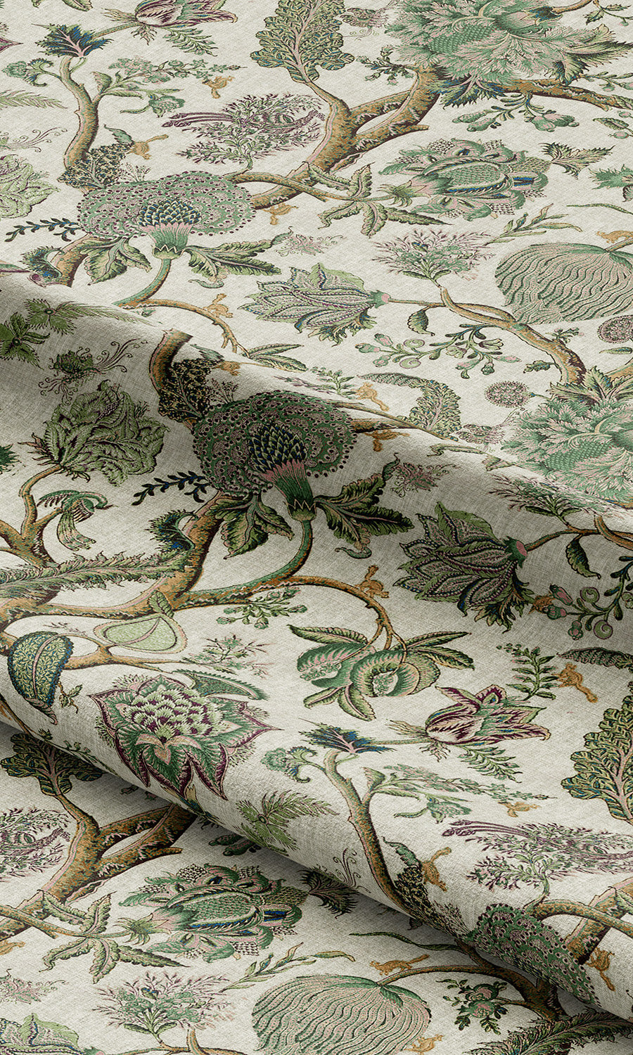 • Its green and brown accents blooming on a pale cream canvas, bringing depth to the design