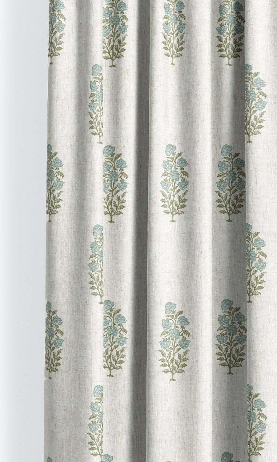 - Decorate the border with trims: Finish Three Farms curtains with blue border trims to add color, texture, and handcrafted charm. Like reeds and blooms swaying in the breeze, trims bring a whimsical flourish that enhances the natural poetry of the fabric's floral motif.
