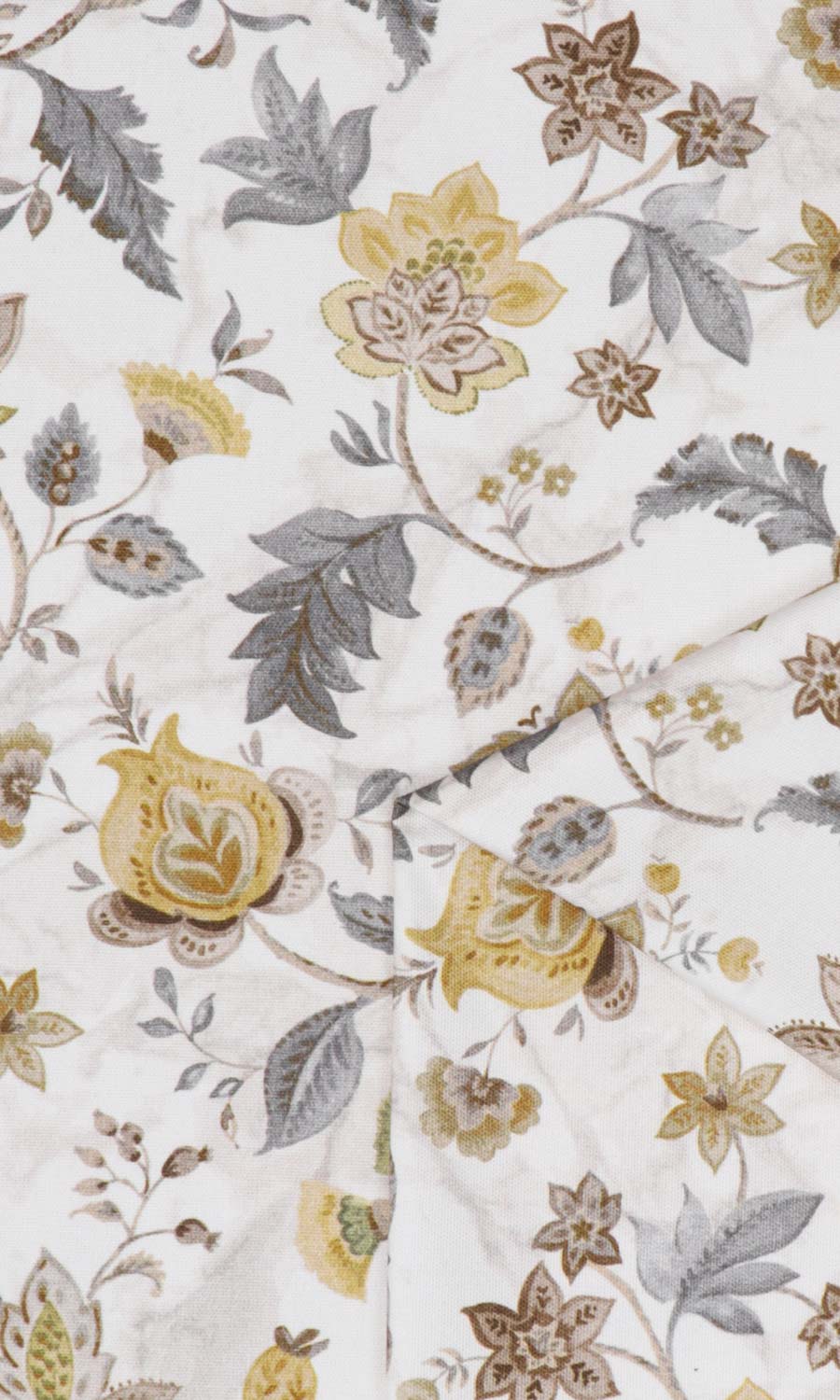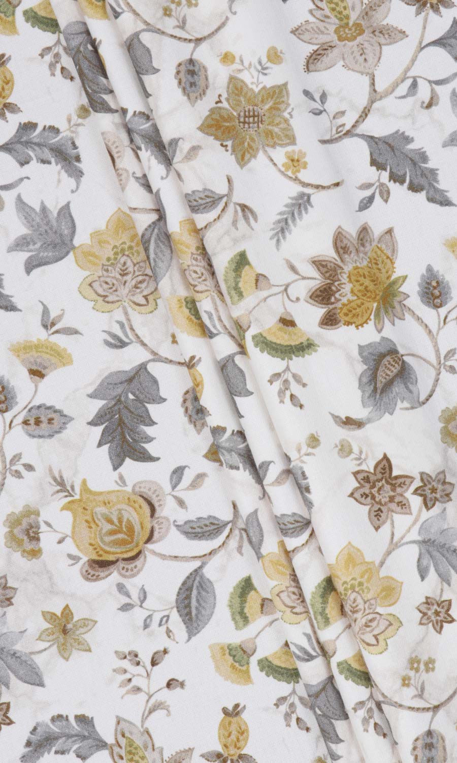 Subtle yet striking, this fabric brings traditional Indian floral motifs with curlicued details. Understated gray leaves recede to the background leaving the stage to delicate yellow-tinged flowers. Embodying eclecticism mixed with sobriety, Tunisia suits both detail-rich bohemian interiors and nature-inspired feminine spaces, embodying a blend of charm and subtlety.