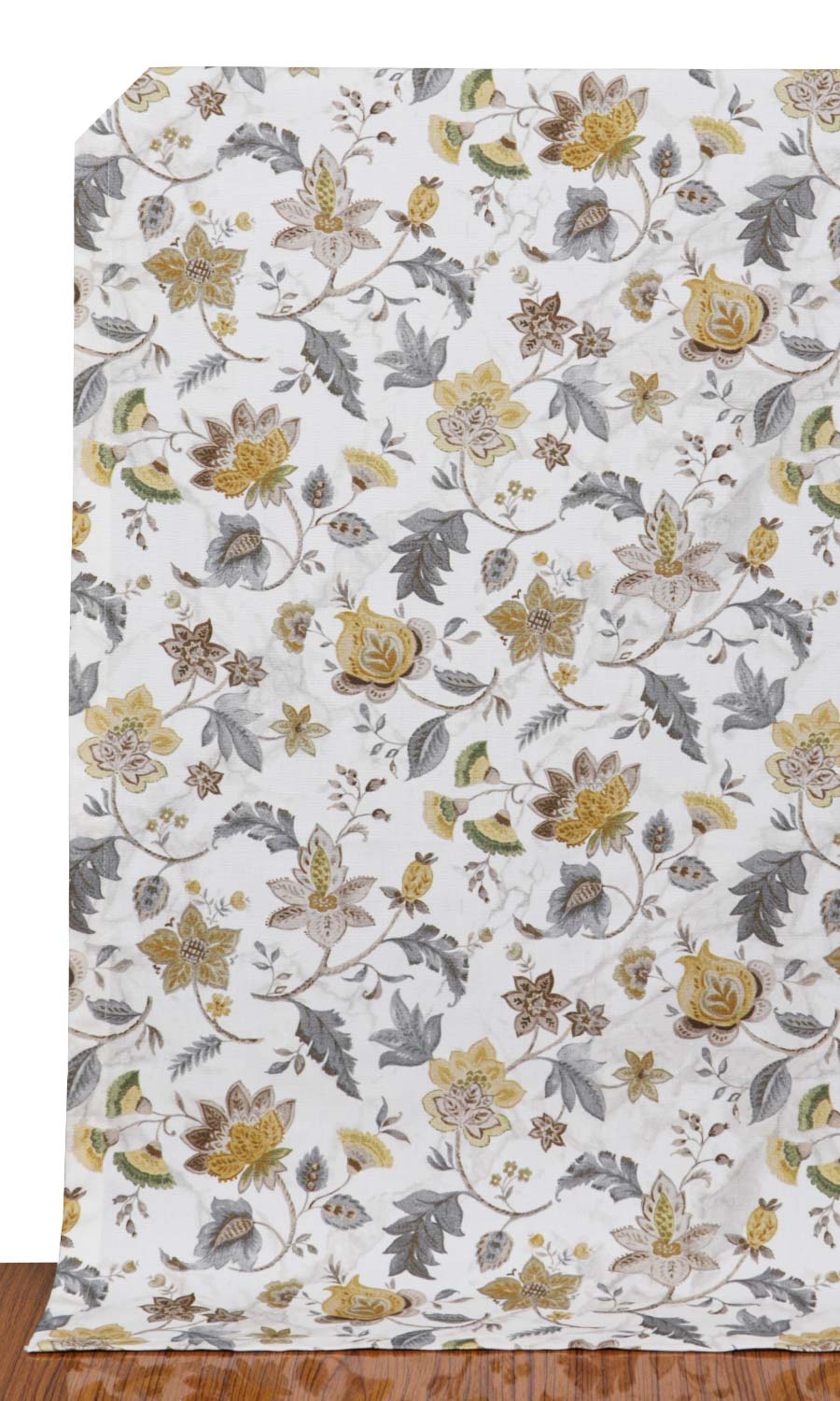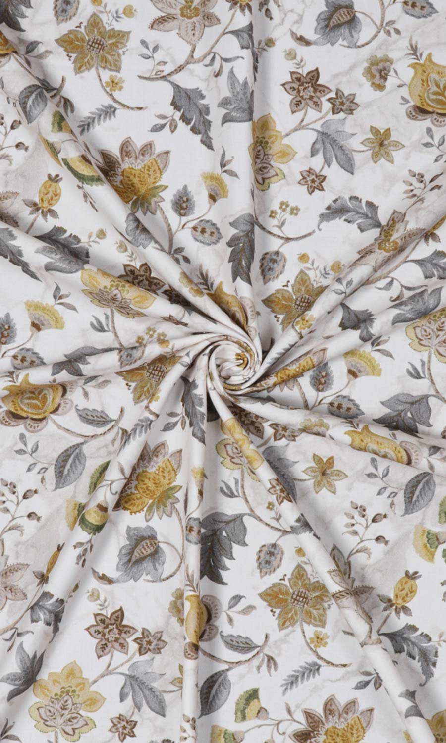 Subtle yet striking, this fabric brings traditional Indian floral motifs with curlicued details. Understated gray leaves recede to the background leaving the stage to delicate yellow-tinged flowers. Embodying eclecticism mixed with sobriety, Tunisia suits both detail-rich bohemian interiors and nature-inspired feminine spaces, embodying a blend of charm and subtlety.